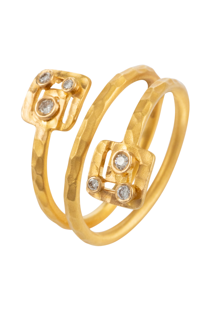 This unique ring features 22K yellow gold and diamonds in a fascinating pattern that you can wear with anything. There are six diamonds that together weigh 0.12 carats. The bezel settings and band feature bright gold that goes well with the flashing fire of the stones. The diamonds are all round cut, and each of them enhances the unusual shape and structure of the ring. The looping design is perfect for when you want to stand out.