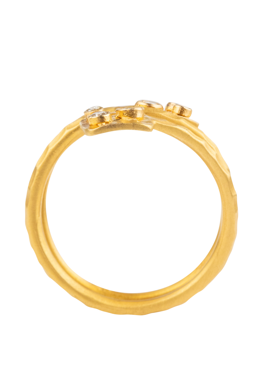 • This unique ring features 22K yellow gold and diamonds in a fascinating pattern that you can wear with anything. There are six diamonds that together weigh 0.12 carats. The bezel settings and band feature bright gold that goes well with the flashing fire of the stones. The diamonds are all round cut, and each of them enhances the unusual shape and structure of the ring. The looping design is perfect for when you want to stand out.