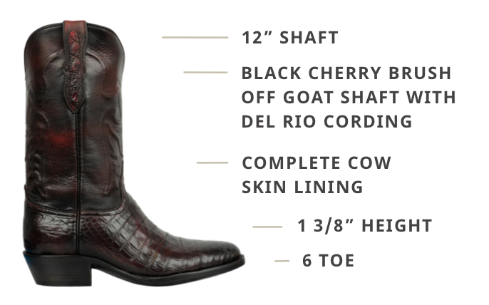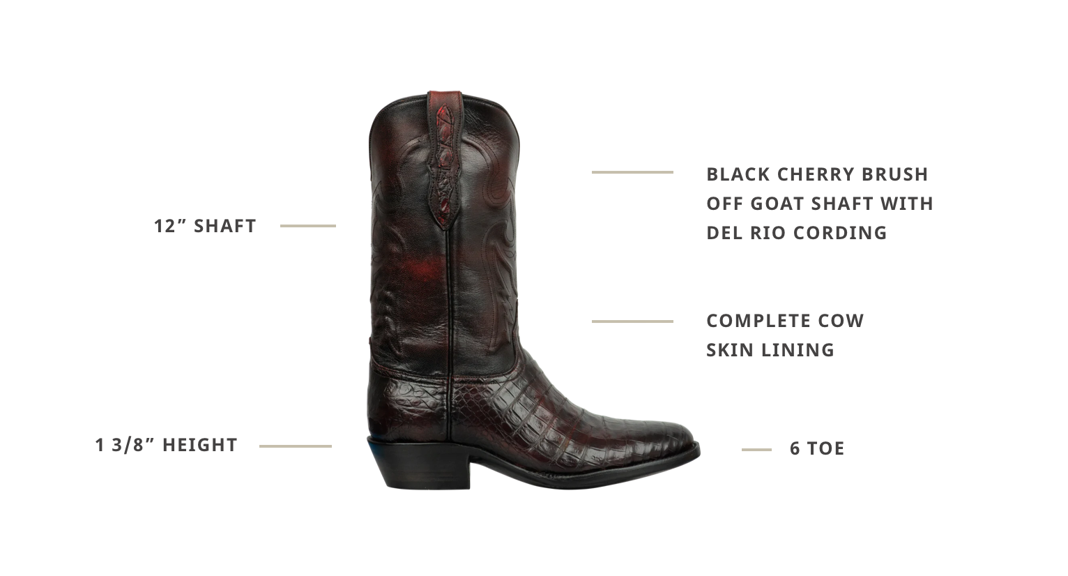 Rooted in American tradition: It’s all about quality through and through wearing a pair of Pinto Ranch By Black Jack cowboy boots. It all begins with the black cherry select caiman belly foot that will keep you cool, comfortable, and confident. This iconic design extends to the 12” shaft with a black cherry brush off goat top and handsome Del Rio cording detail. The pull straps also feature a caiman belly overlay. Comfort is key here with a complete cowskin lining. With a 1 3/8” stacked heel and roomy round toe, there’s no doubt your Black Jacks will take you everywhere you want and need to go.