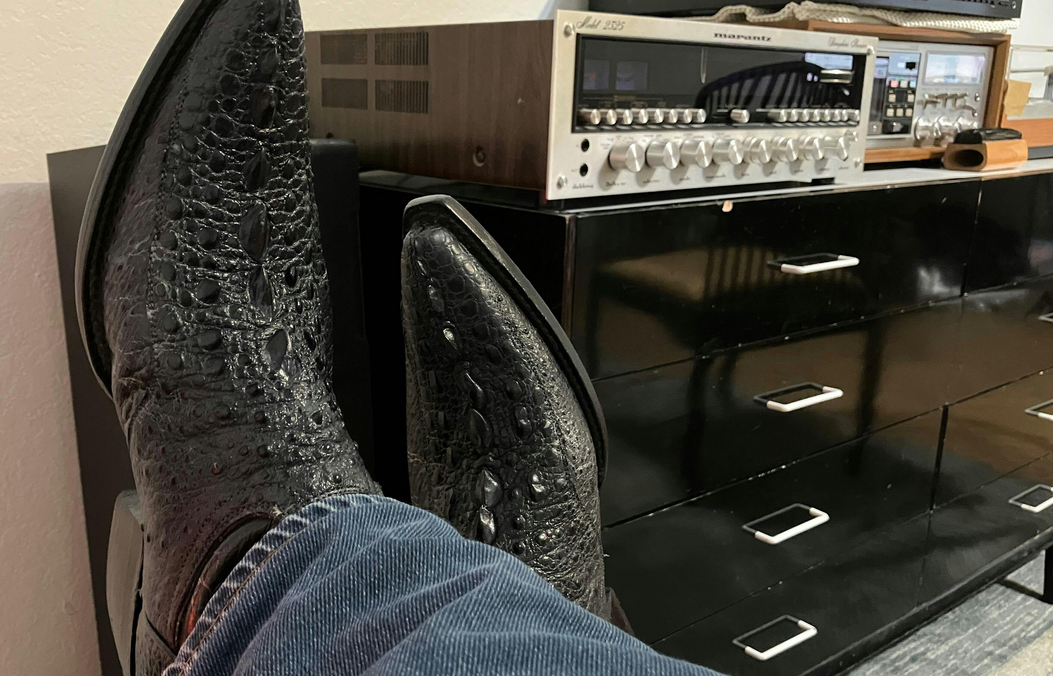 Black Jack's snapping turtle boots feature a waxahachie cord pattern and navy goat shaft. This classic style has snapping turtle overlay on pull strap, a snip toe and a 1 1/2" cowboy heel. Made in El Paso, Texas exclusively for Pinto Ranch.