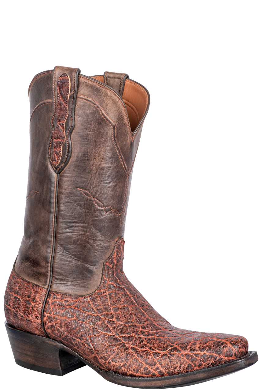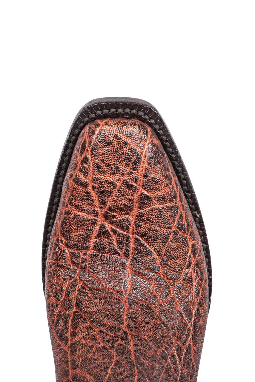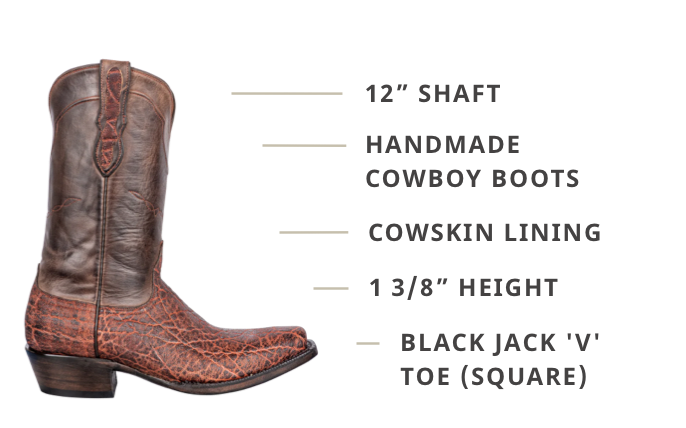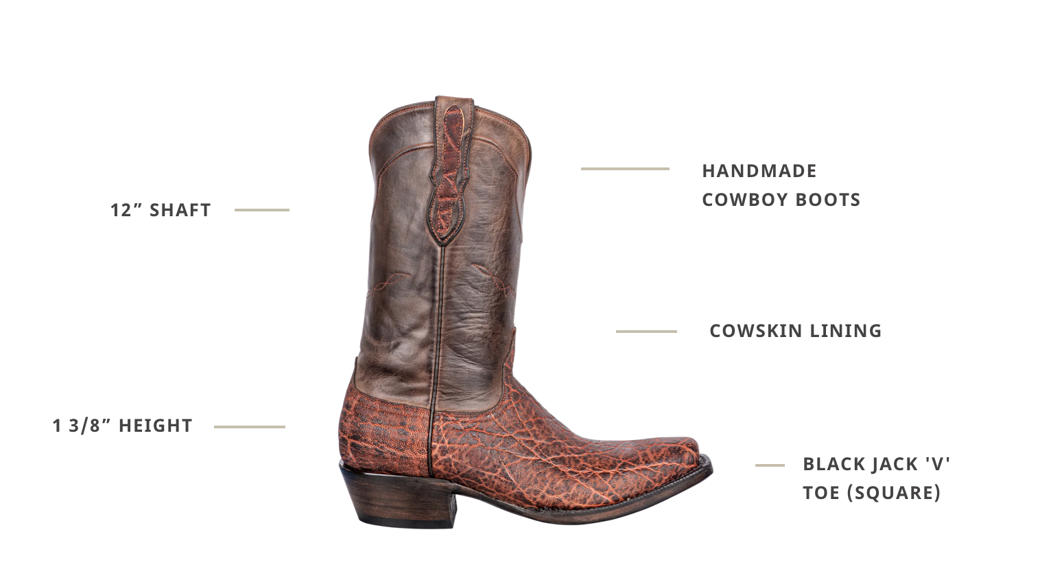 Pinto Ranch by Black Jack brings us a brilliant blend of yesterday and today. Our exclusive Vintage Chestnut Elephant Cowboy Boots showcase the natural texture of exotic elephant skin in a deep, rich chocolate brown and complementary chestnut hue. This super soft all-leather boot is a handsome combination of premium materials and outstanding quality craftsmanship. The 12" Mad Dog goat shaft featuring a classic cowboy cord detailing flows throughout. An elephant skin overlay on the handy pull straps adds a layer of design and texture. Extremely durable and true to the iconic Black Jack brand, these boots are meant to take you on any adventure the open road leads.