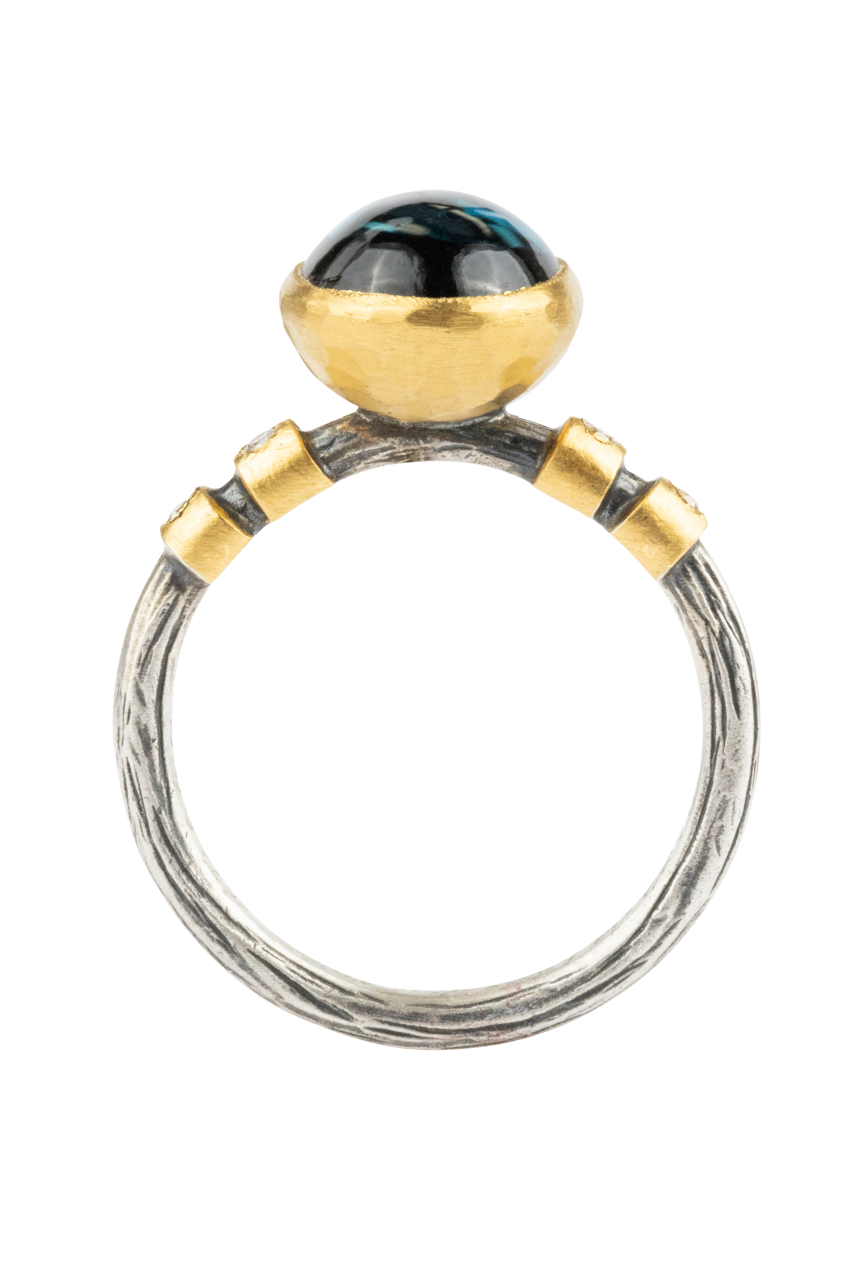 • This 24K gold and silver blue topaz ring is breathtaking with a round 5.20-carat topaz gemstone you won't be able to take your eyes off of. But take a deeper look, and you'll notice two small matching diamond accents on either side of the gold bezel. Whether you choose to wear it every day or to a special occasion, all that's needed to keep it looking its best is a soft polishing cloth.