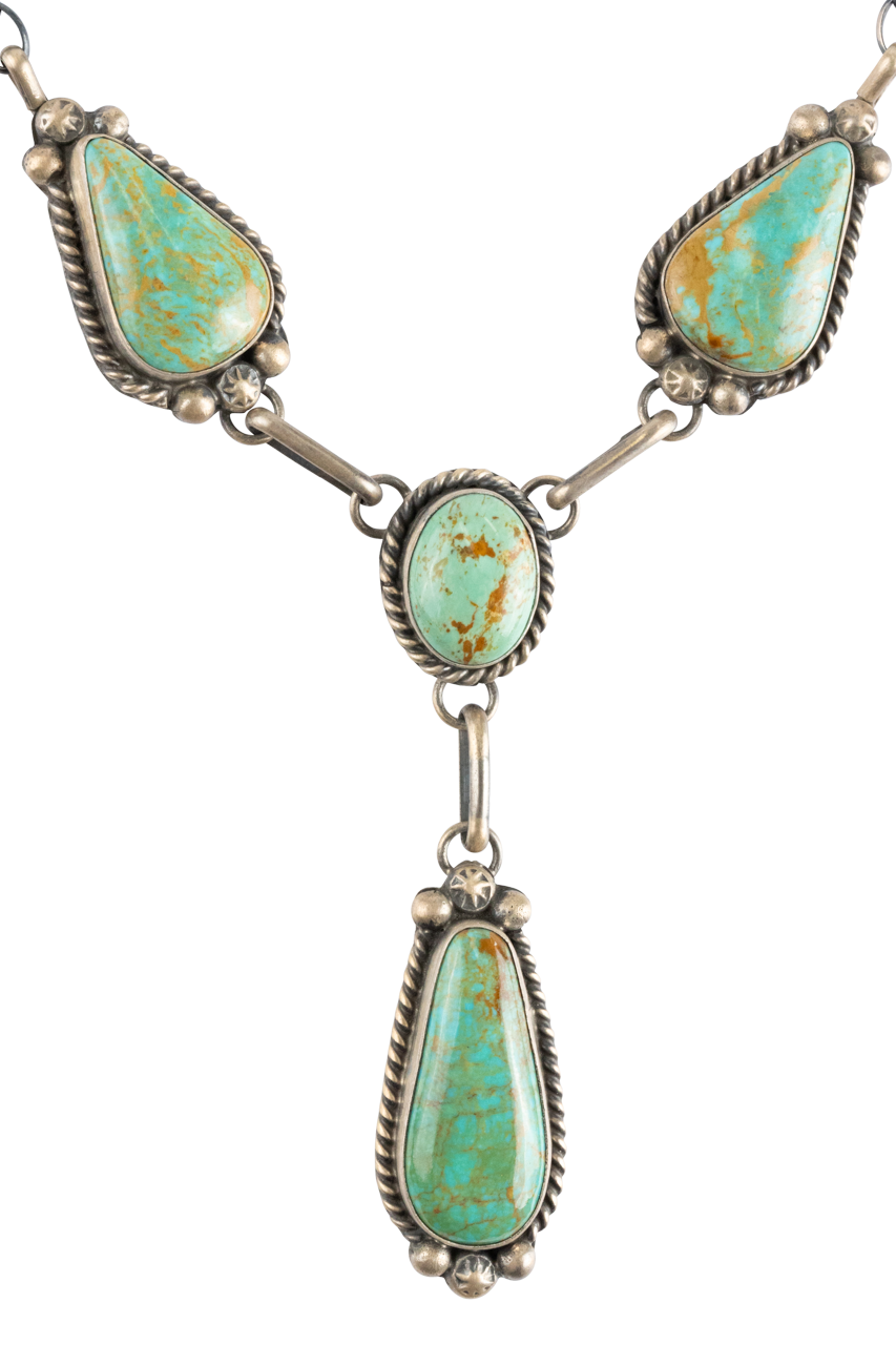 This hand-crafted Native American necklace is a masterpiece of traditional styling and amazing natural materials. The Cerrillos turquoise pieces are perfect with the silver bezel settings and chain. This type of turquoise is highly prized for its green and blue hues set against a matrix, and was made in the USA with care. The four large turquoise pieces are each unique, and the necklace is a one-of-a-kind way to make a statement about your style.