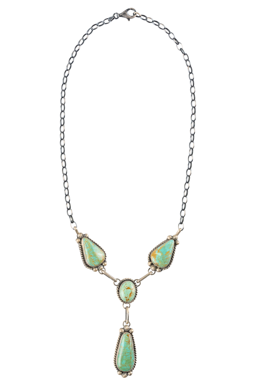 • This hand-crafted Native American necklace is a masterpiece of traditional styling and amazing natural materials. The Cerrillos turquoise pieces are perfect with the silver bezel settings and chain. This type of turquoise is highly prized for its green and blue hues set against a matrix, and was made in the USA with care. The four large turquoise pieces are each unique, and the necklace is a one-of-a-kind way to make a statement about your style.