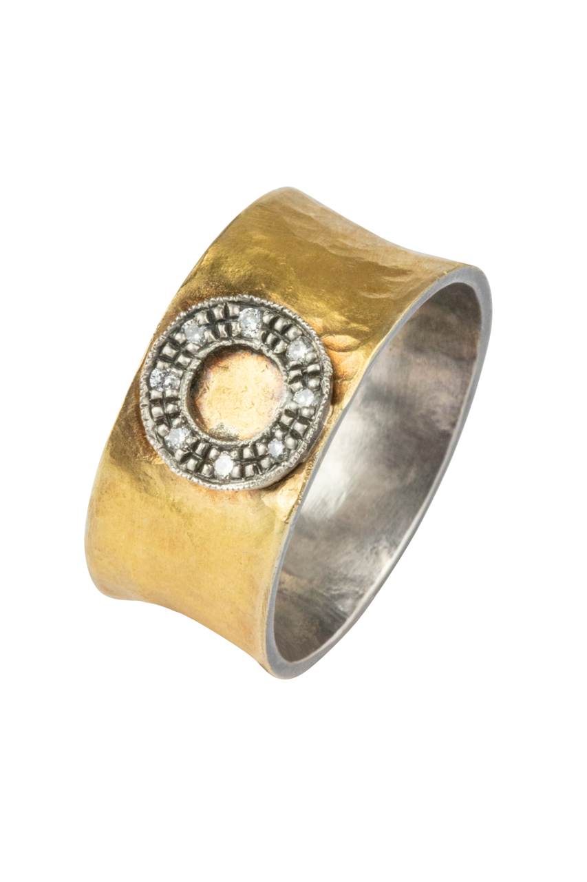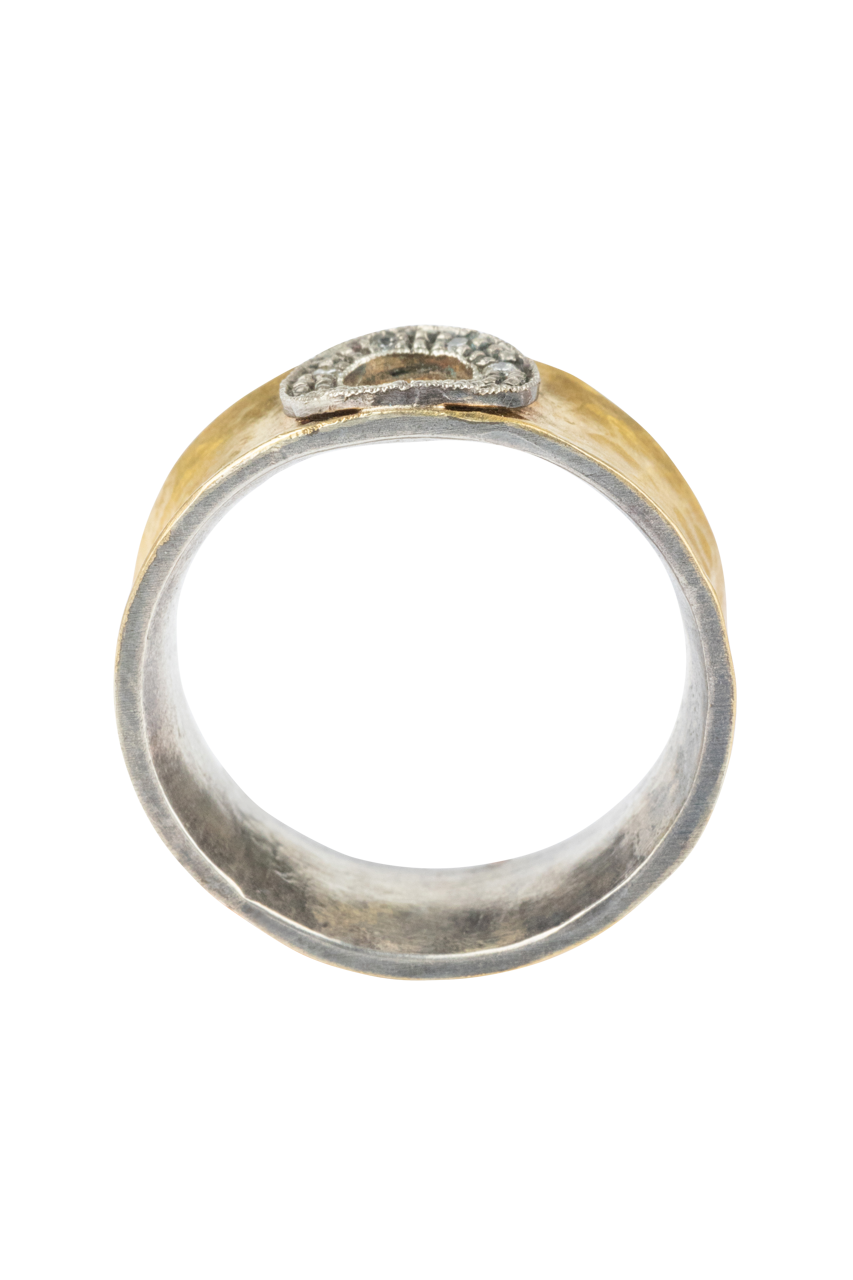 The silver and gold of this ring are perfectly opposed, with the 24K yellow gold on the outside and its silver on the inside, and it has a unique shape that won't be like any of your other rings. In the center is a stylized silver circle that is punctuated with several small diamonds. There are 0.10 carats of round-cut diamonds set to accent the imported ring and give it flashes of brilliance.