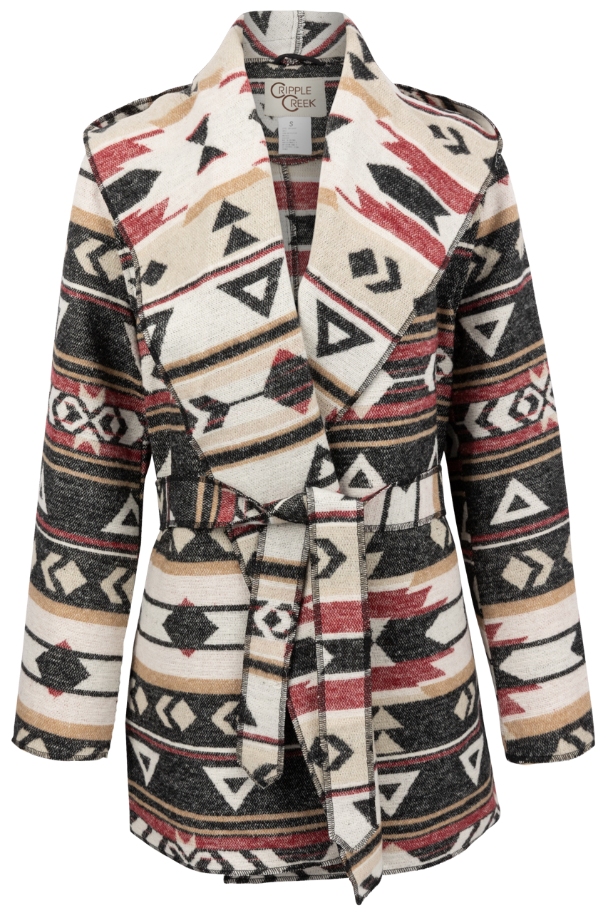 • From Cripple Creek comes our Women’s Navajo Tie-Front Blanket Wrap Jacket with asymmetrical front closure, oversized lapel, and a waist cinching belt for more fitted wear. This sweater jacket with hoodie is perfect for casual afternoons when worn with jeans, or to keep you warm on chilly nights when paired with your favorite athleisure wear.