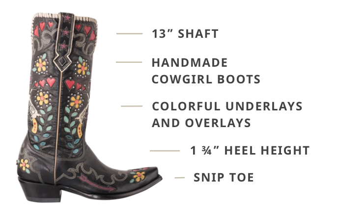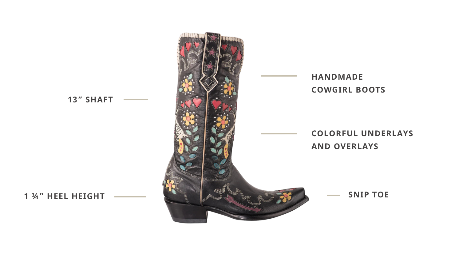 Bang bang! These boots were made for more than just walking. Show off the powerful woman you are inside with these Double D Ranch Cowgirl Bandit boots, made for the woman who knows what she wants and has the gusto to work for it. An incredible overlay and underlay design, featuring pistols, hearts, crystals, stitching, and more. A polished black finish adds a sleek, sexy finish to these fun and powerful boots.