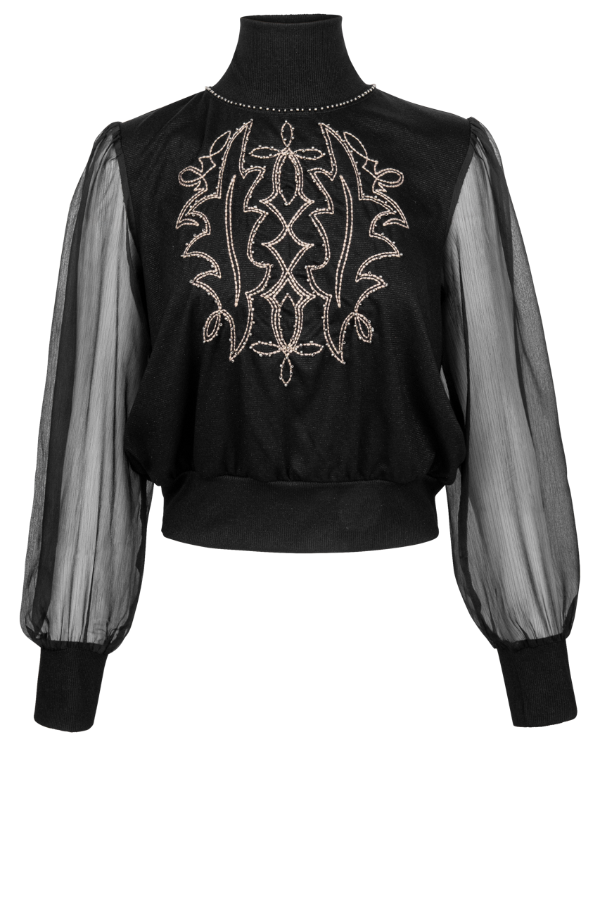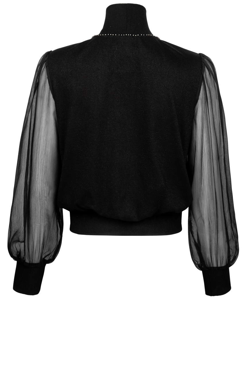 - Full coverage body with sheer balloon sleeves