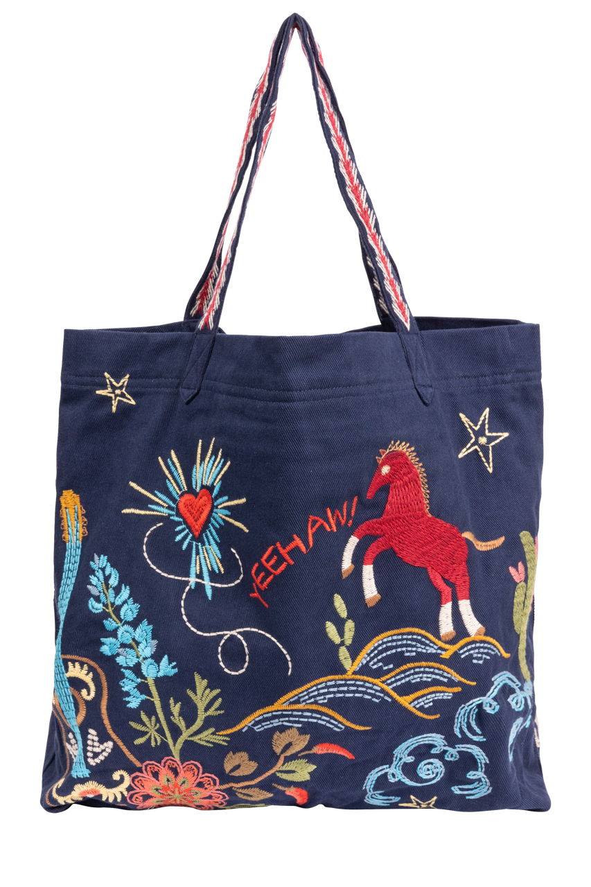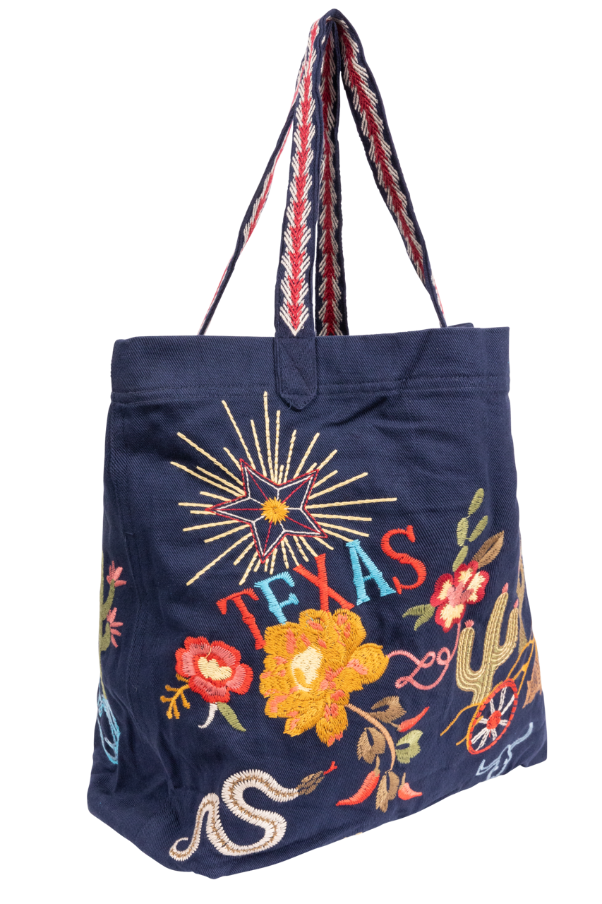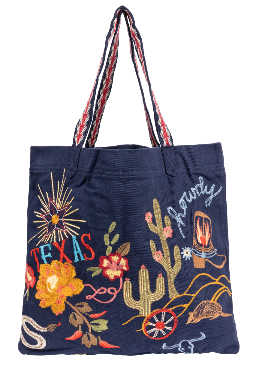 - Navy tote with vibrant Texas icons (cactus, rose, boots, stars, armadillo, bluebonnets, guitars)