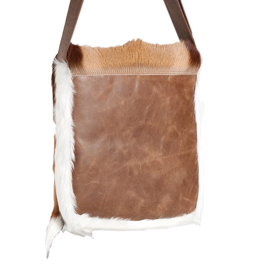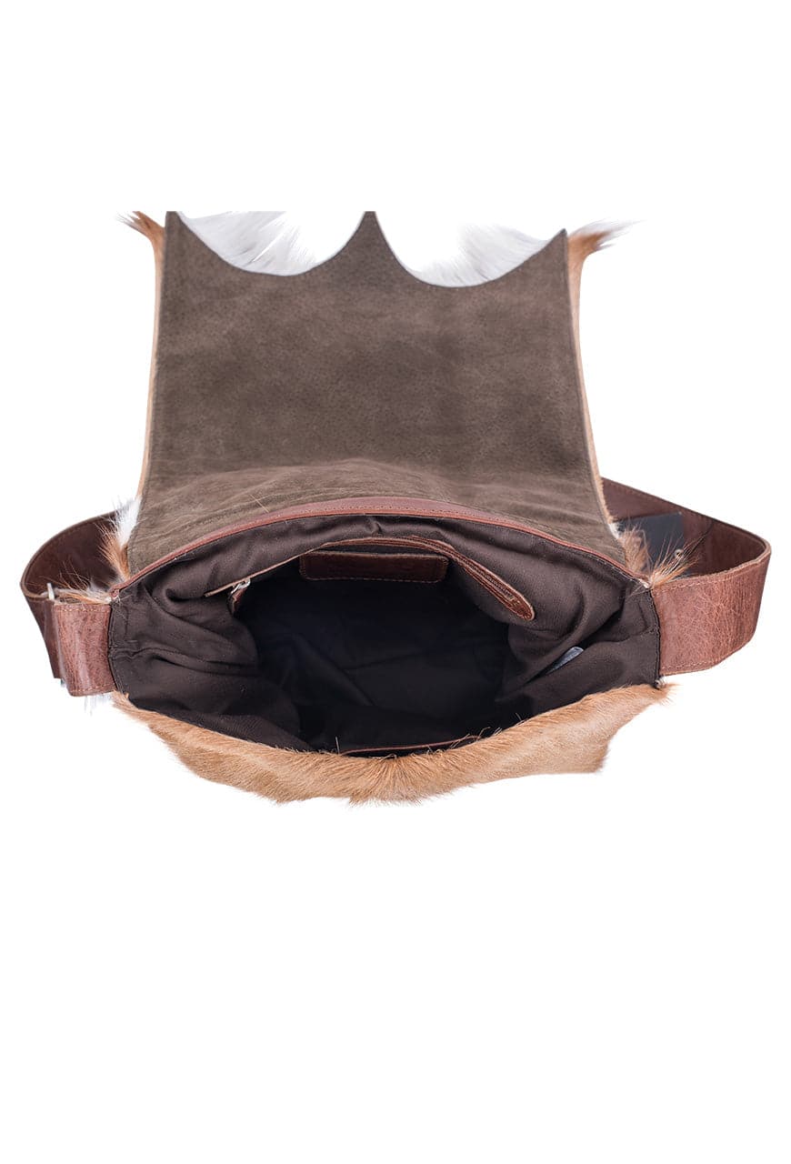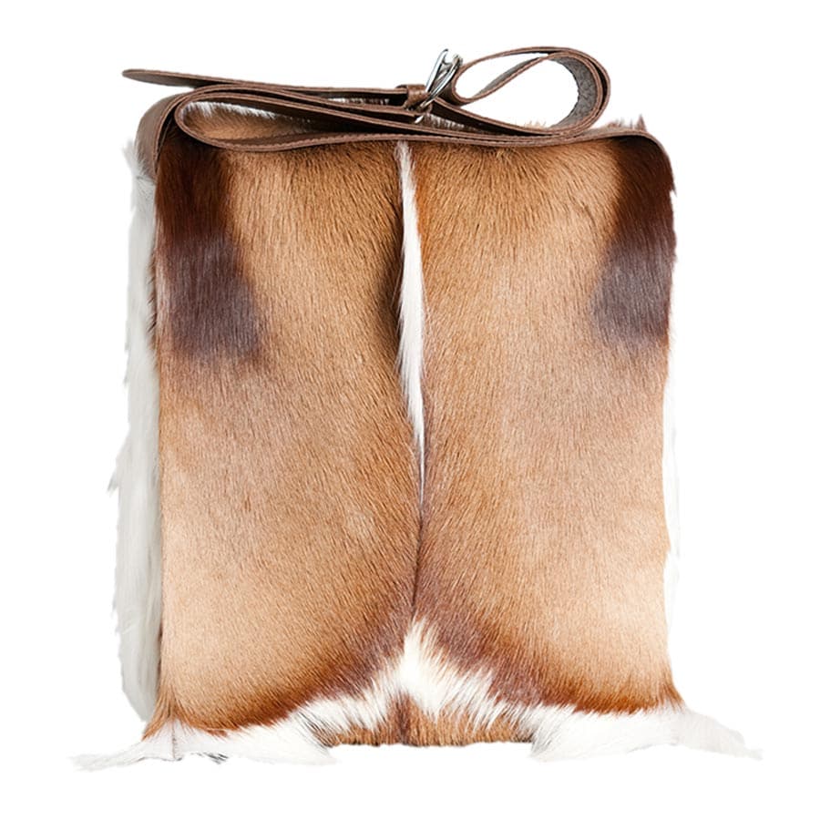Springbok antelope hair-on-hide foldover bag with brown leather adjustable strap. Magnetic snap closure on front flap. Inside features 1 zippered pocket and large open compartment.