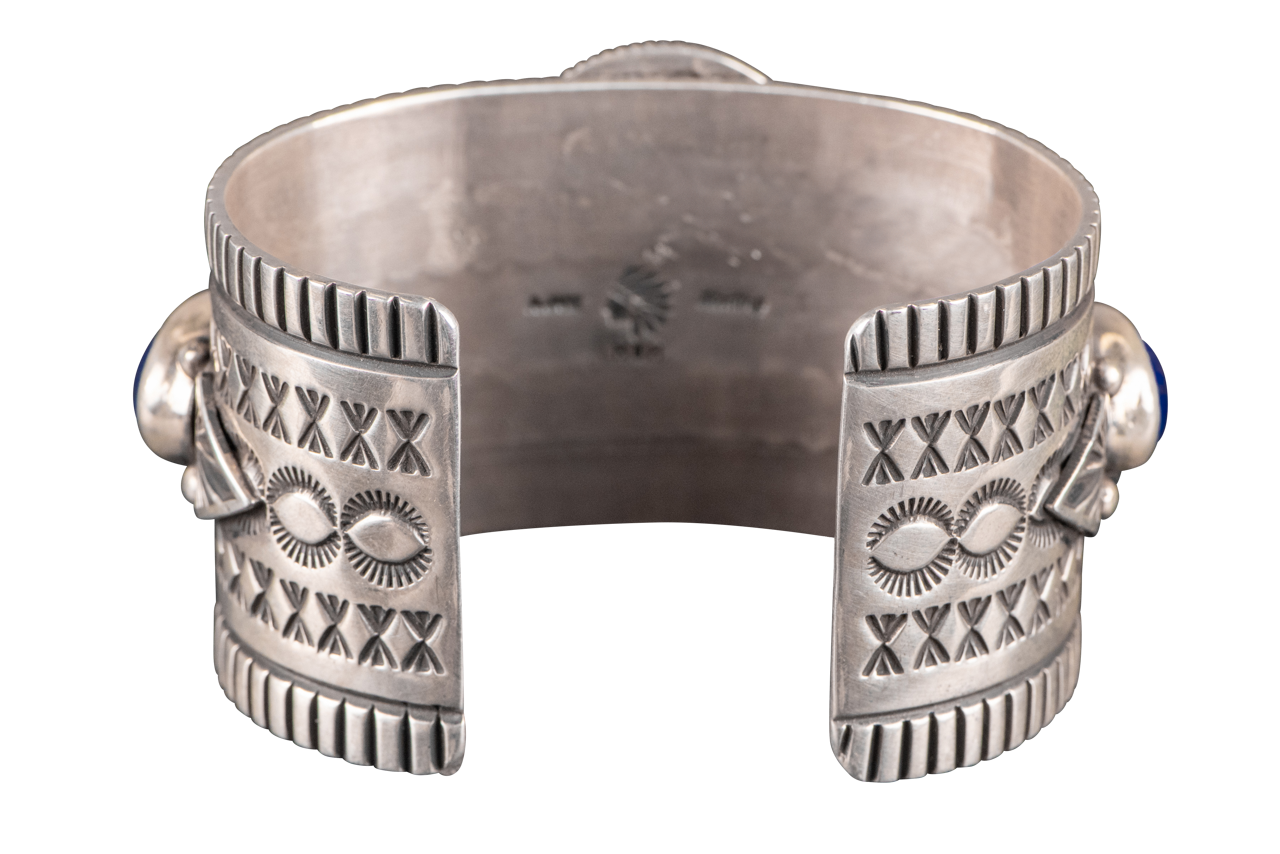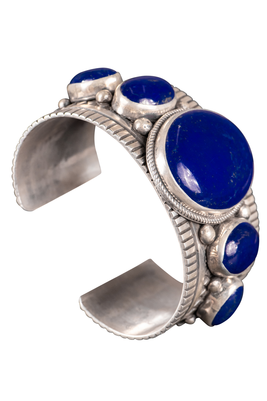 • Place this chunky bracelet on your arm, and it will turn heads. The brilliant blue of the lapis lazuli stones, one of the deepest blue stones available, makes a pleasing contrast against the brushed sterling silver setting. Since ancient times, the lapis lazuli stone has been worn to symbolize wisdom, strength, and love. Embrace these traits by adding this bracelet to your jewelry collection. It features five stones on a hand-engraved silver band. The largest stone in the center has two smaller stones on each side. Each stone sits in an individual sterling silver setting, surrounded by ornaments that add even more interest to the piece. The engraving on the band itself adds interest and makes the silver more than just a holder for the stones, but an intricate addition to the jewelry. Because the bracelet has an open design, it easily slides onto most arms, making it a statement piece that fits most Western wardrobes. The bold blue color will draw admiration, causing you to reach for this piece again and again.