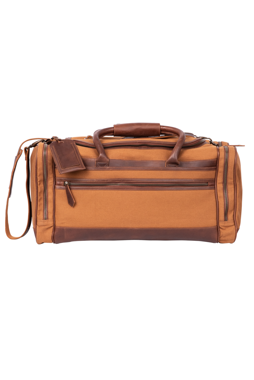 Ready When You Are: This is the duffle bag to get you through the hustle and hassle of traveling with ease. You’ll be the envy of everyone carrying this anything-but-ordinary travel companion constructed with a rugged, timeless design that checks all the boxes. Spacious 22” size, durable tan leather-trimmed cotton canvas, coordinating leather luggage tag, comfortable versatility, check! The innovative half-moon opening makes packing and unpacking a breeze with three interior pockets to keep essentials secure, and two zip-closure end pockets providing even more convenient storage.