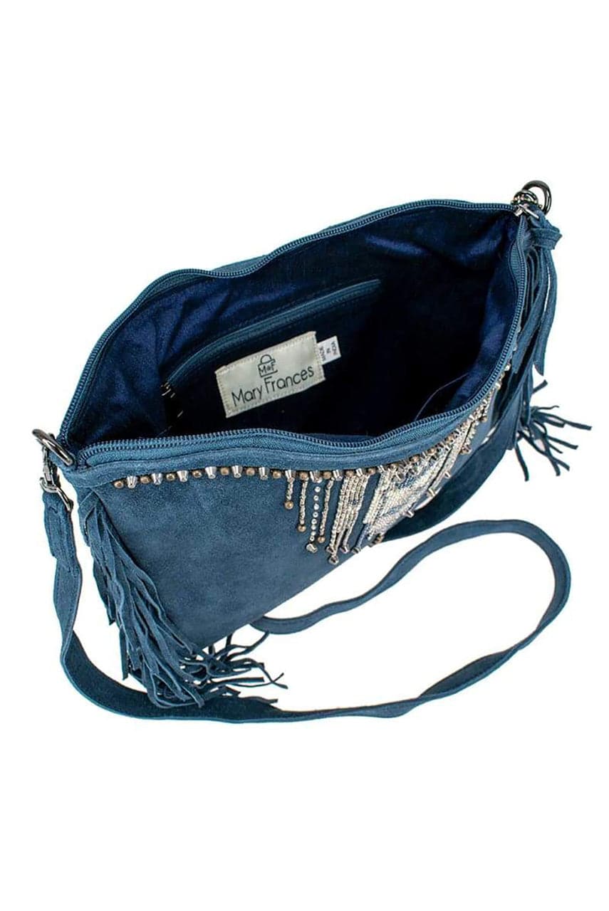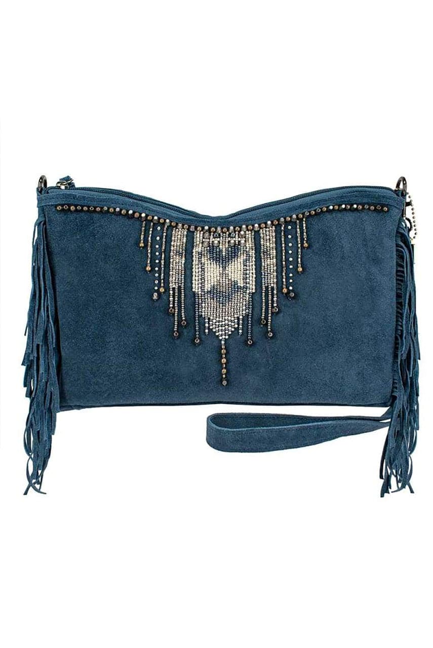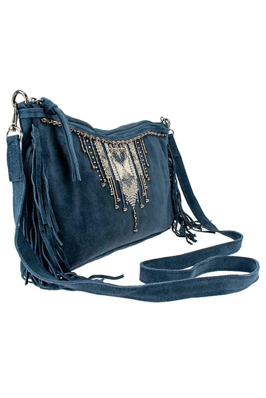 Denim blue suede embellished with hand-sewn beads and studs and swinging side fringe for a look that's easy to wear and hard to resist!