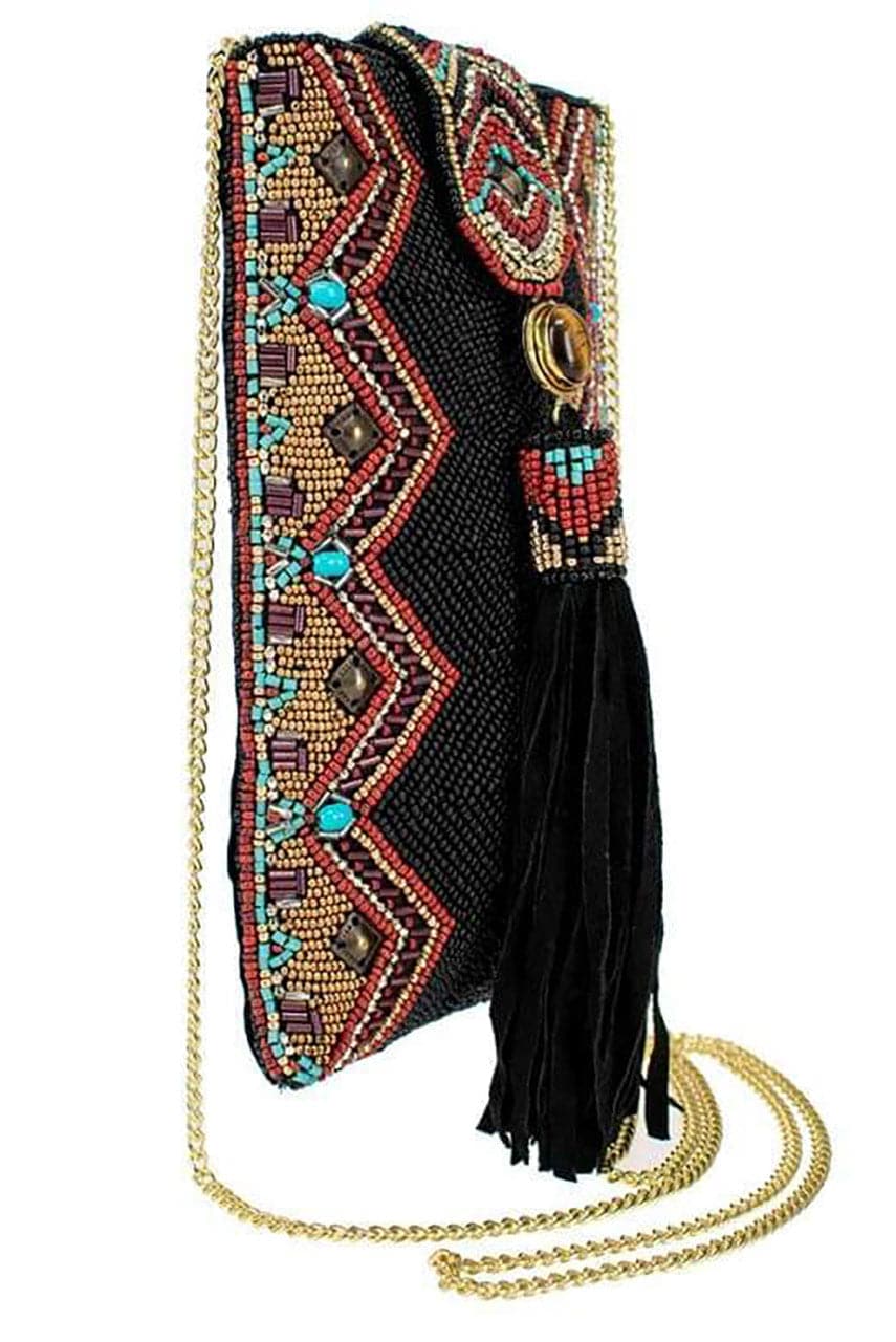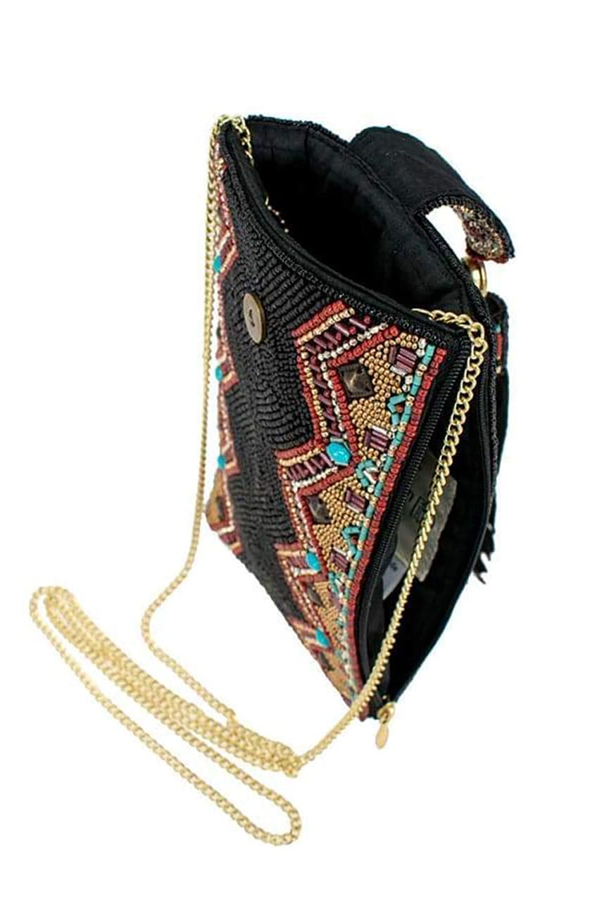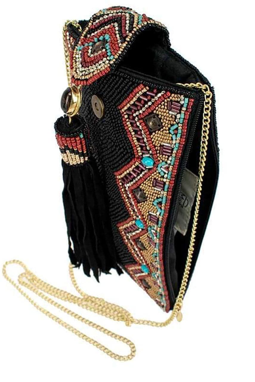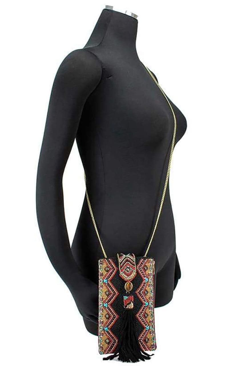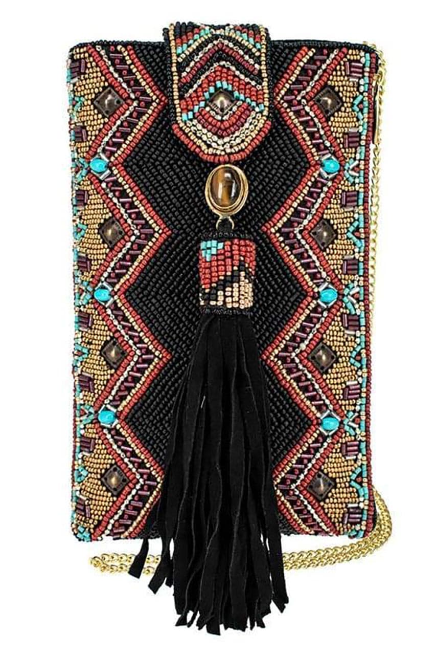 • Mary Frances Crossbody Phone Bags are the perfect multi-functional fashion statement! Slide your phone in the top slip pocket, store all your essentials in the side zip pocket. Higher Ground is and-crafted with thousands of glass beads and natural Tiger Eye Gemstone, plus a touch-friendly clear back panel lets you use your phone without having to take it out!