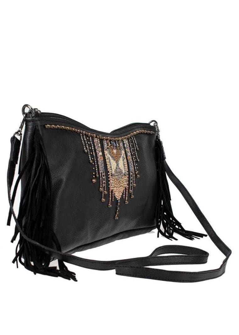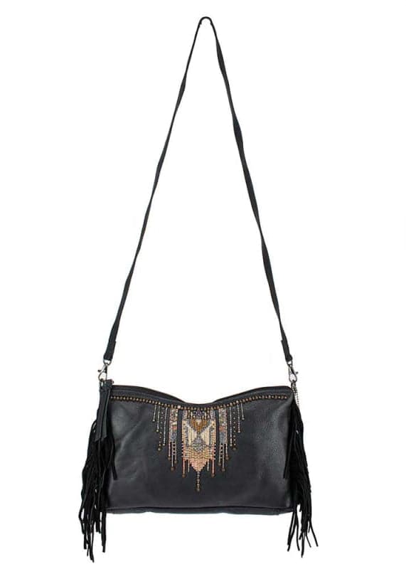Soft black leather with hand-beaded center design and suede side fringe create a timeless look for year-round wear!
