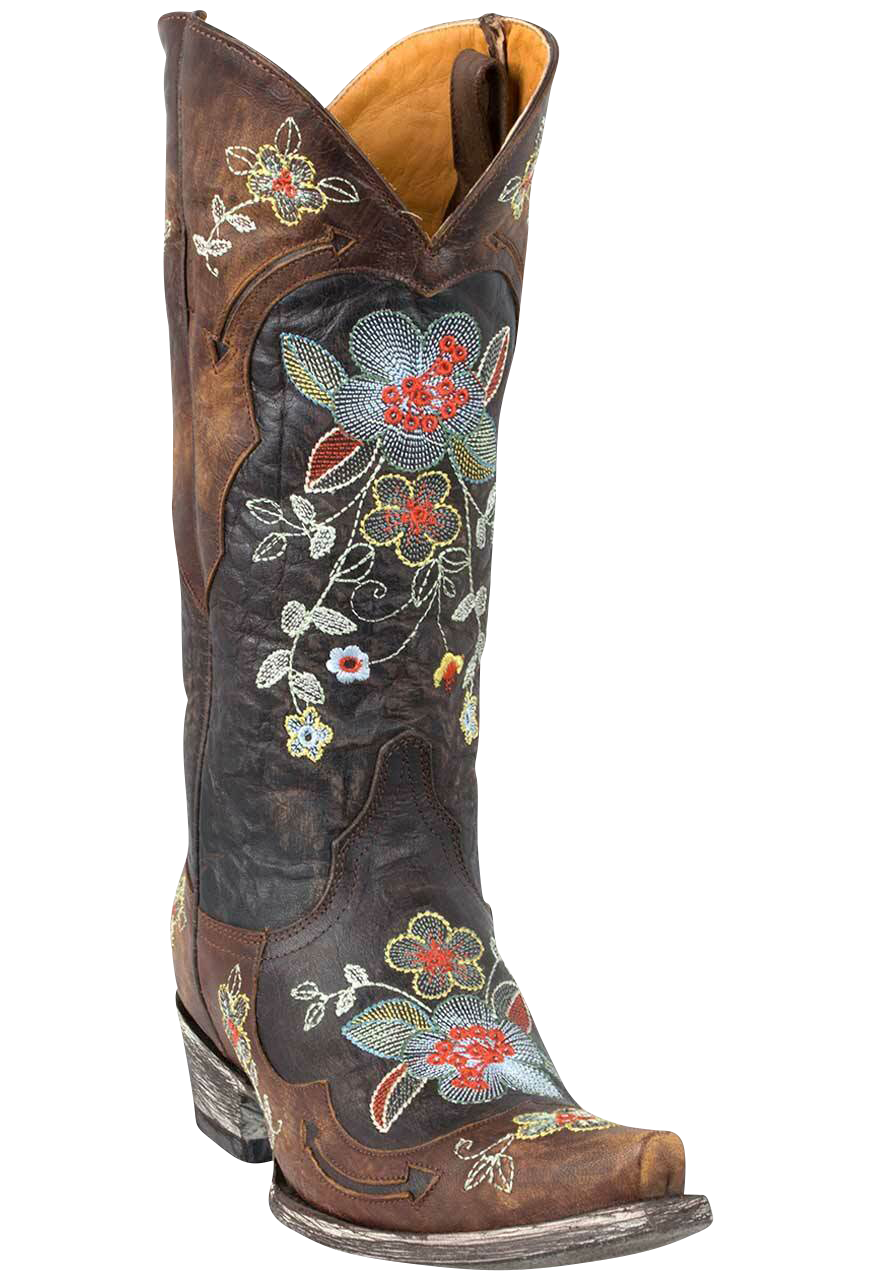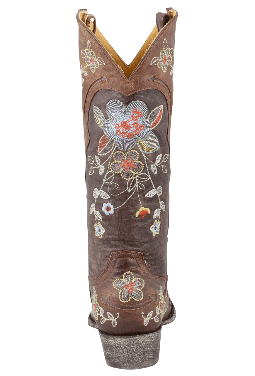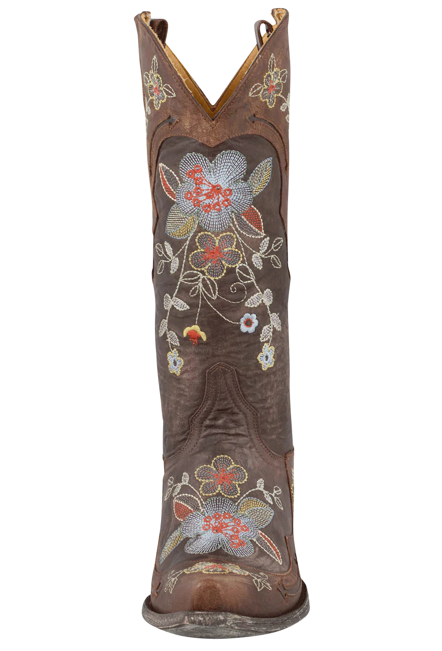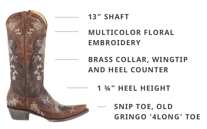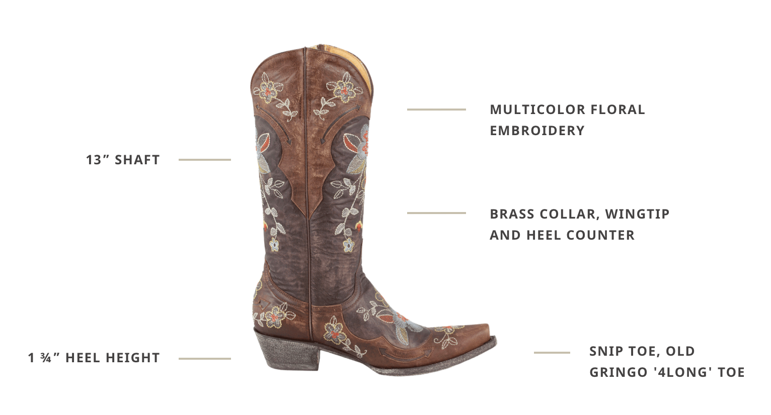 The Bonnie Boots by Old Gringo are romantic and hint at spring days. Reminiscent of an old cowgirl show boot with a distressed brown shaft and foot, and brass leather wingtip, collar and heel counter. The brass collar, wingtip and heel counter as well as the brown shaft are adorned with a tumble of blue, red, yellow and ivory embroidered flowers and vines. The heel and outsole are distressed for a more vintage appearance that will only look better over time.