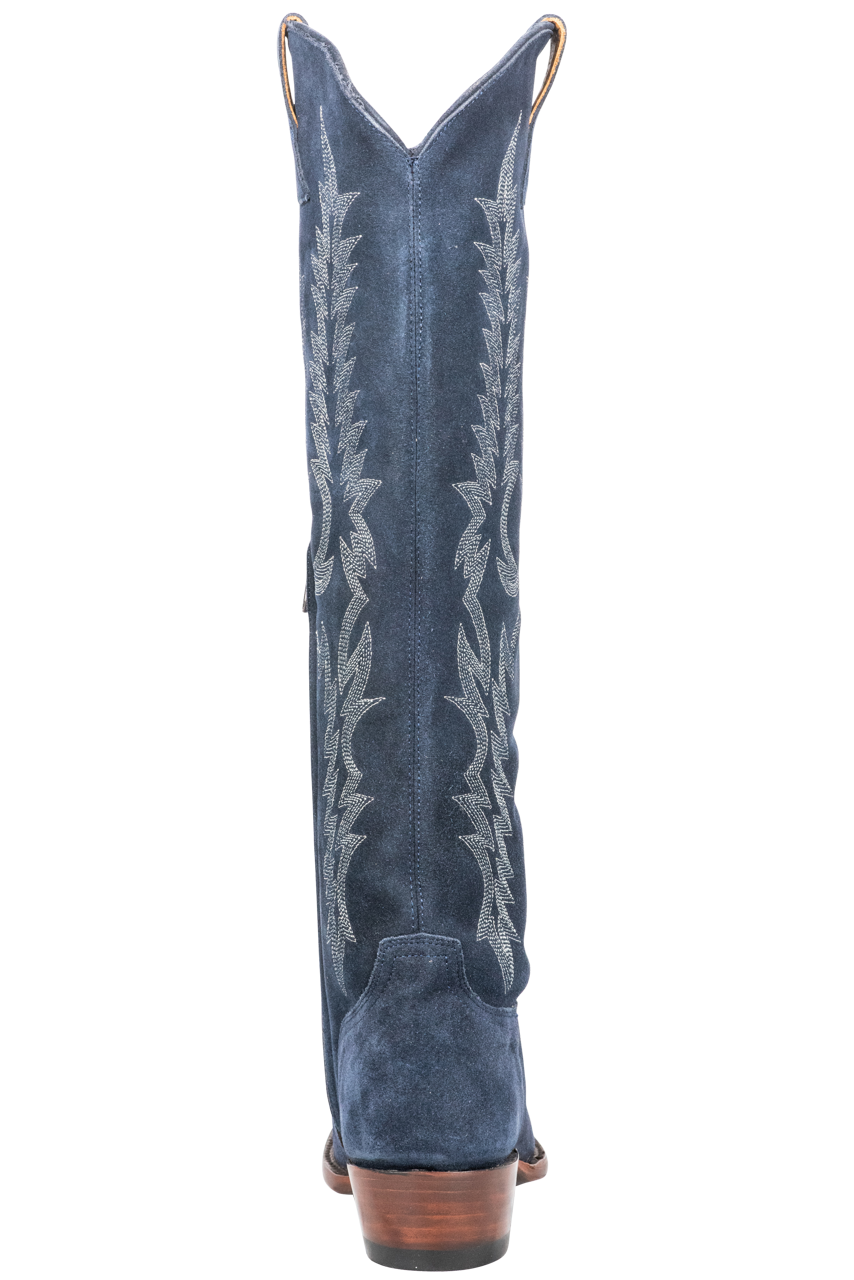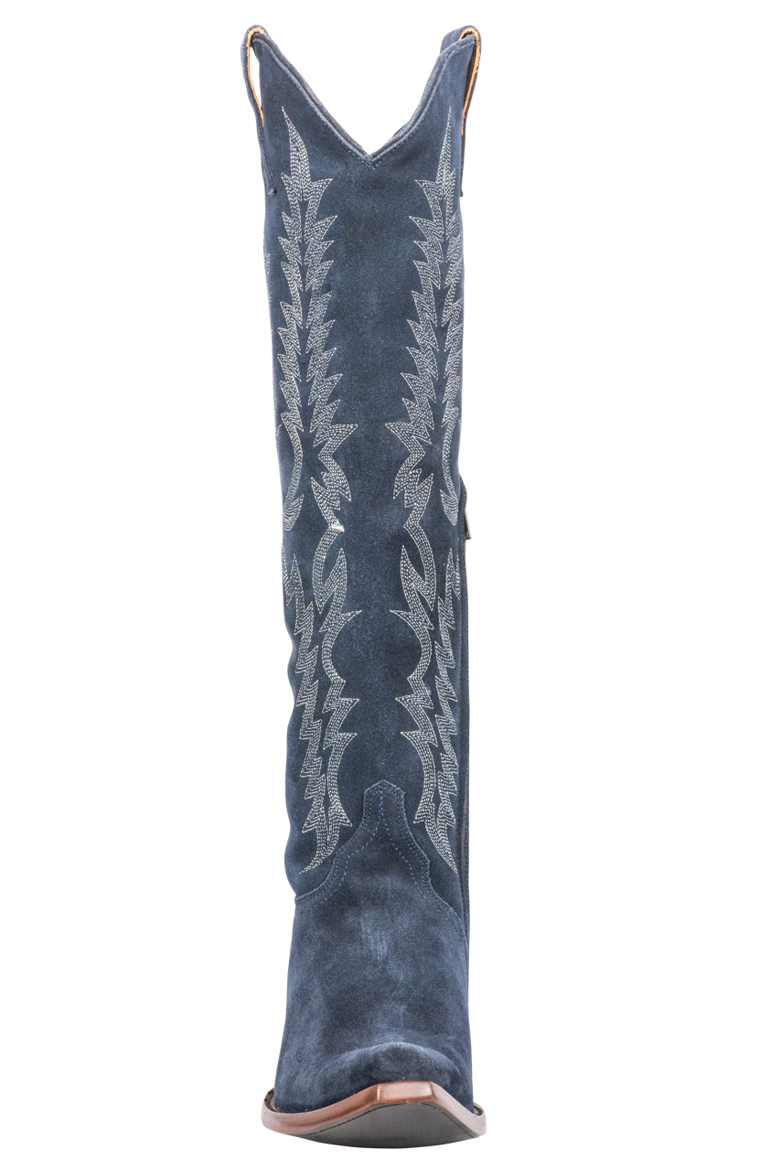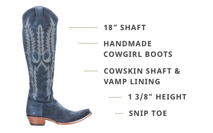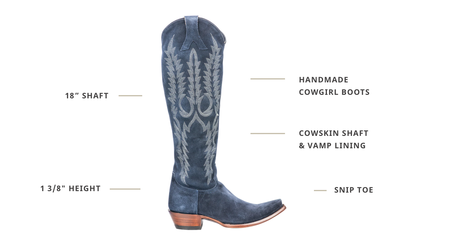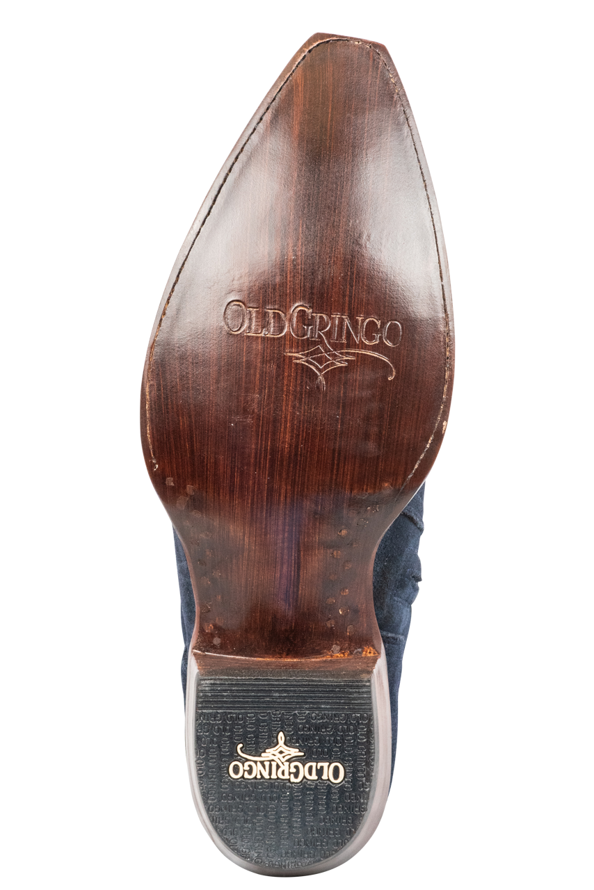 Versatile Navy Knock Out: These stunning hand-crafted cowgirl boots will get you noticed for sure. Old Gringo has mastered the art of redefining a Western classic and Mayra is the perfect example. Deep blue navy suede sets the tone for these all-leather beauties. The ultra-flattering 18” tall shaft features an artistic traditional Western stitched pattern. The vamp is solid navy, emphasizing the snip toe and 1 3/8 inch heel. Comfort is key with a hidden 1/2 zipper inside the ankle and leather pull straps for comfortable, easy on and off. The fashion sky is the limit with Mayra. Whether you wear her with your favorite patterned shirt dress, a flirty mini skirt, or tucked into denim jeans, have fun mixing and matching colors, patterns, textures, and accessories. This navy knockout is as versatile as your personality and individual style.