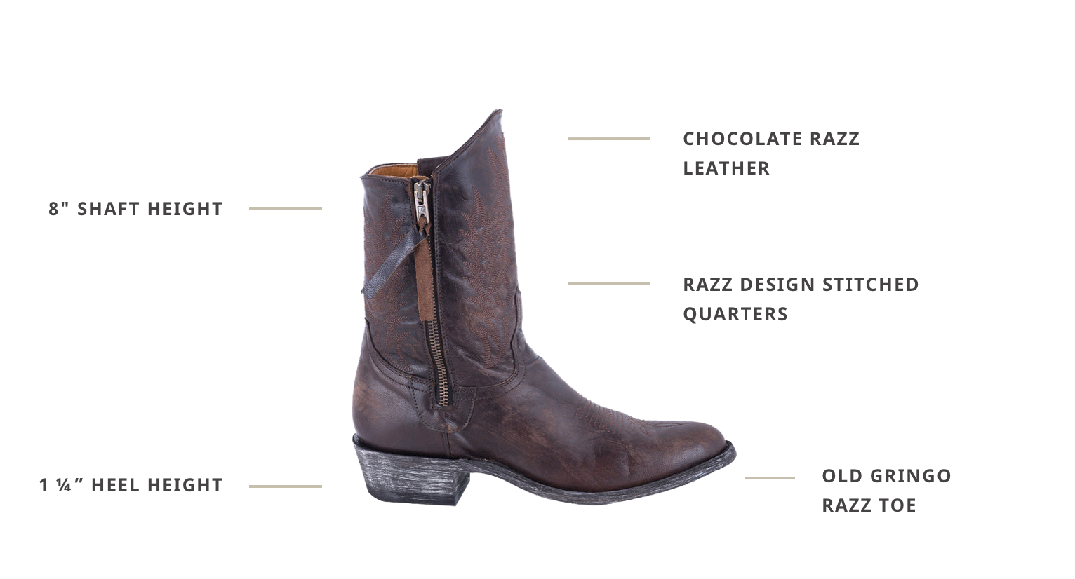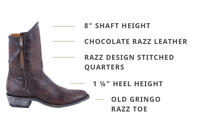 Much like the Nevada or Mayra, this short boot has an exciting stitch pattern that Old Gringo is known for. Unlike other Old Gringo classics, this boot goes for a more understated look. The exciting Razz stitching is in a rich chocolate thread that nearly matches the chocolate leather itself, making for a subtle design with a unique look. This boot is fun and fun-sized, so you can enjoy all the parts of a cowgirl boot you love in a smaller package.