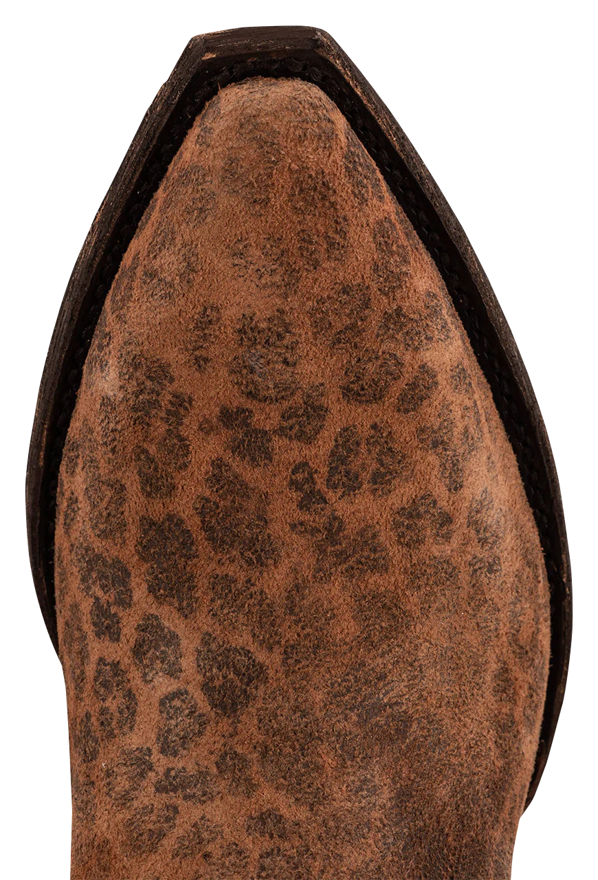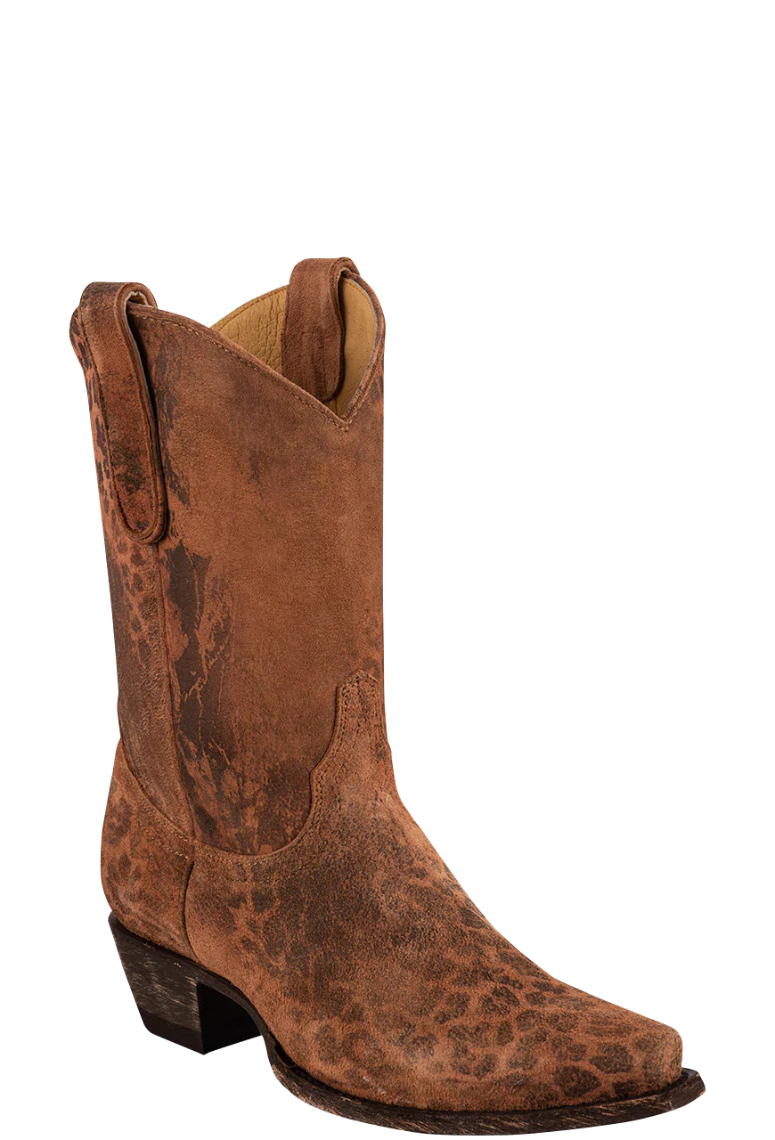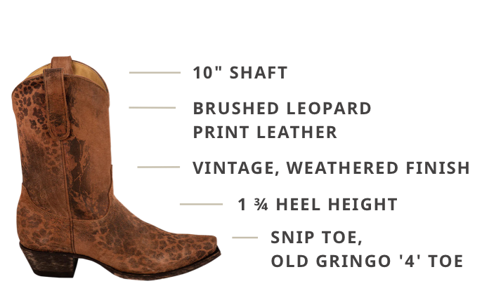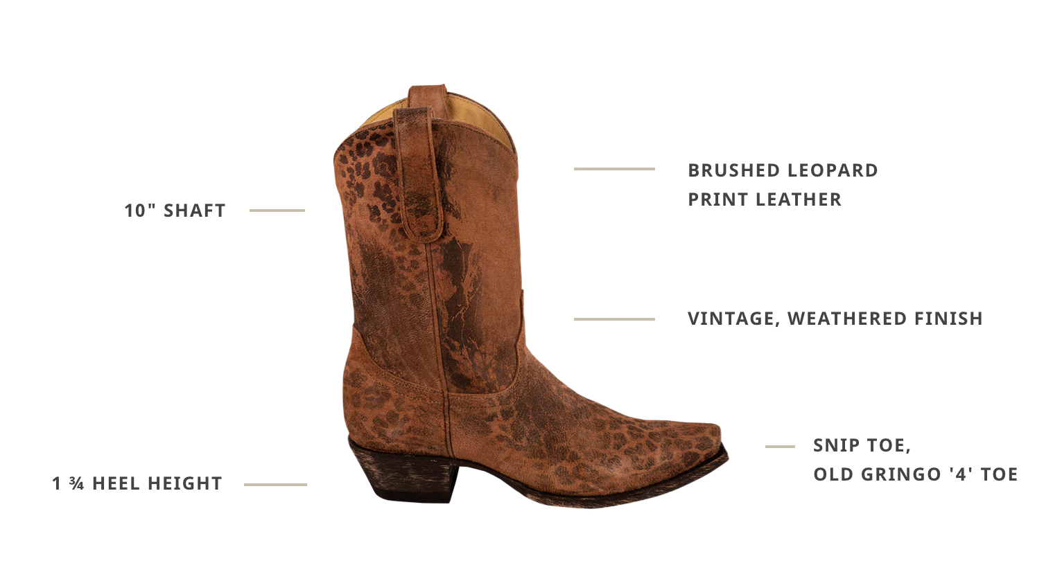 Take a walk on the wild side with the Leopardito Ochre Boots by Old Gringo. The boots feature brushed leopard print leather and a fashionable 10" shaft height. With a vintage, weathered finish these boots are made with a soft leather lining and leather foot bed to provide all-day comfort. The snip toe and cowgirl heel makes for that classic western look. These are perfect to pair with a short dress or your favorite jeans.