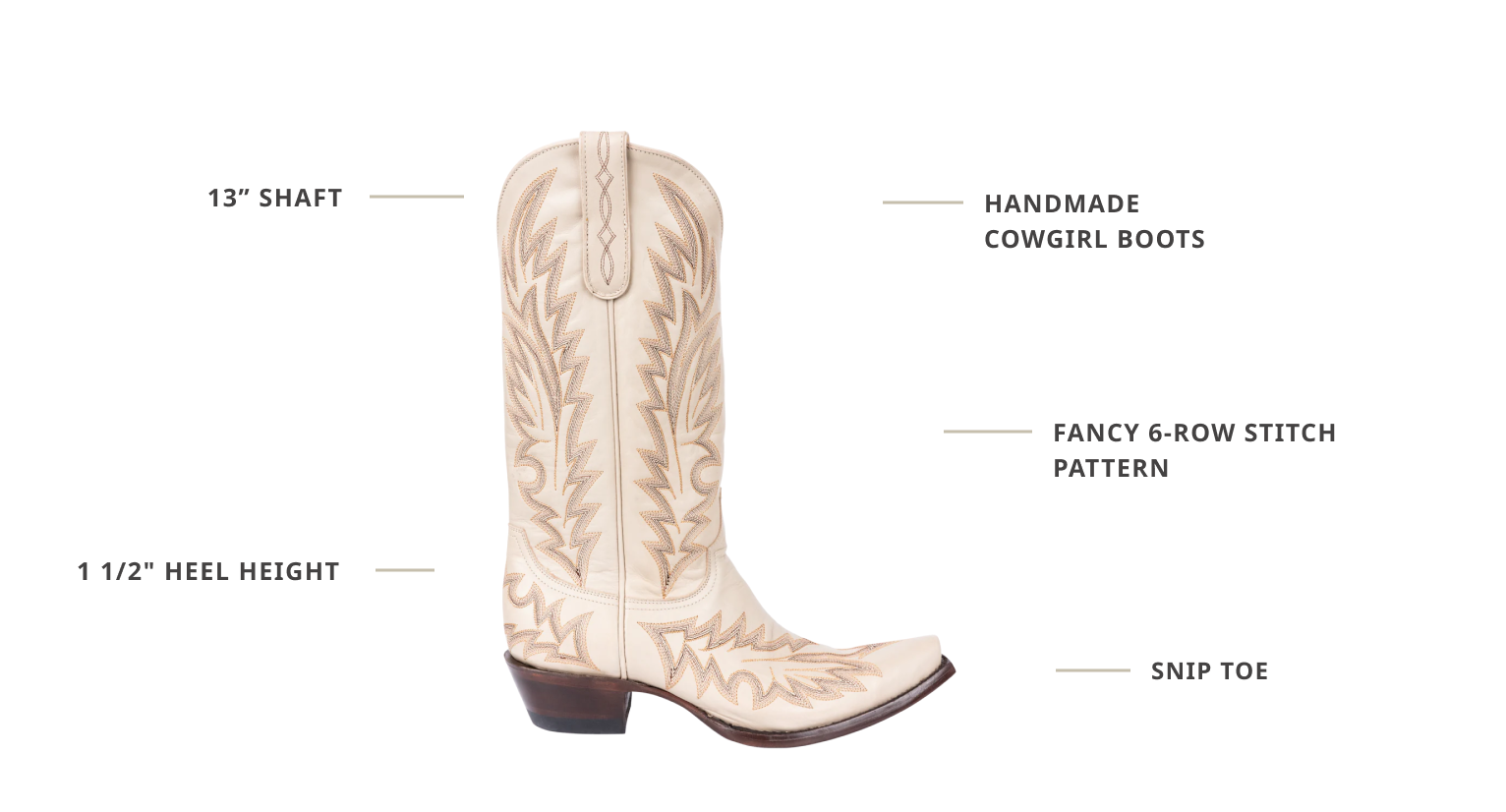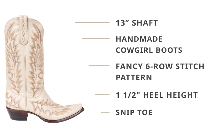 Step into a pair of handmade Old Gringo’s Yippee Ki Yay Boots, that will enhance your style and instantly elevate your mood. A gorgeous creamy neutral with touches of artistic detail, is the perfect addition to your Western wardrobe. Each and every pair of Old Gringo boots involves an intentional, meticulous 275- step production process by master artisans. This age-old, trusted tradition guarantees the finest quality materials and craftsmanship. You'll love the fancy 6-row stitch pattern on the vamp, heel counter, and shaft adds texture and dimension to the cowhide leather. Simple, yet stylish, classic, yet chic, these incredible creations are meant to stand out in a crowd. And like all Old Gringo creations, comfort is key. The 13” shaft, leather insole, 1 1/2” heel, and snappy snip toe work together for a perfect combination of ultimate anytime, everyday wear. Whether you wear them to work, out on the town, or an exciting weekend adventure, your Yippee Ki Yay Wilkie Cowgirl Boots are sure to steal the show!
