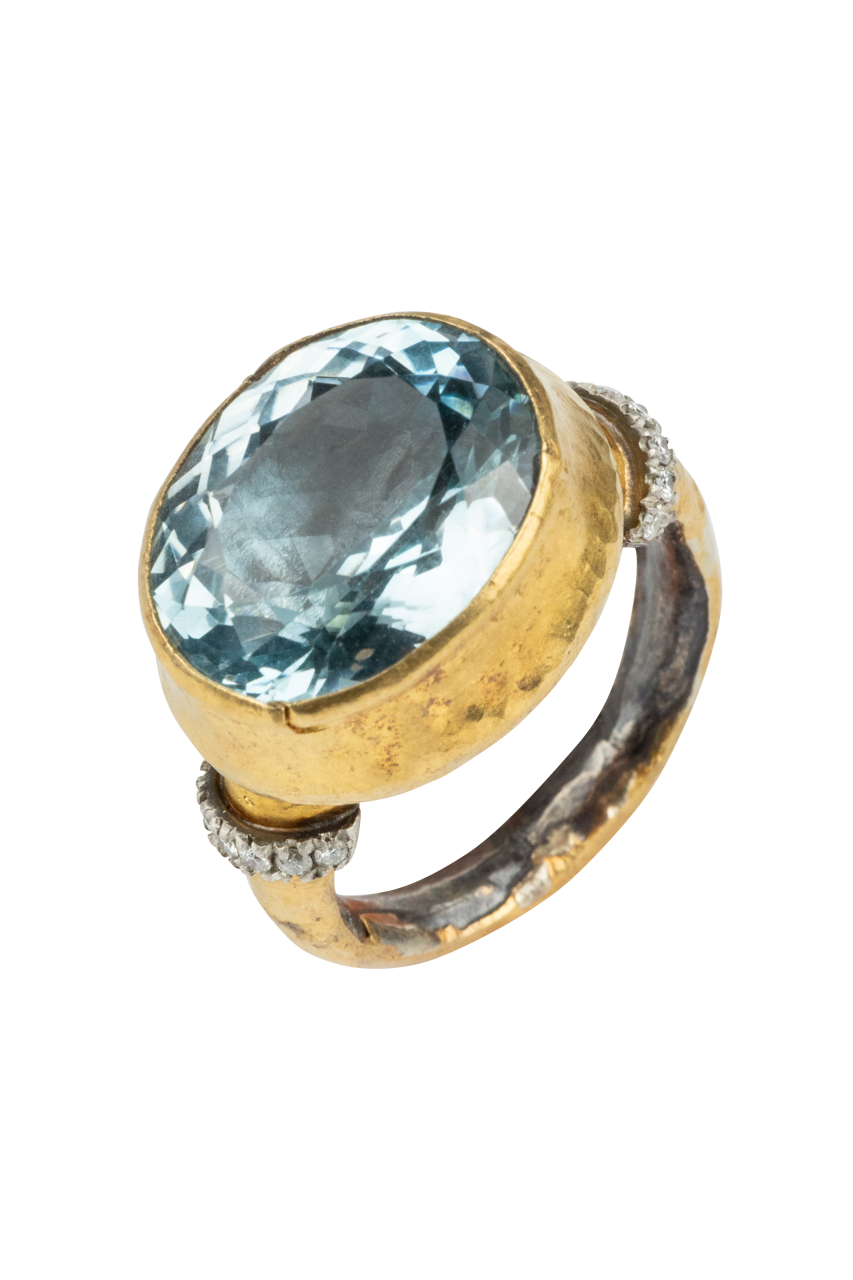 • Topaz may be synonymous with the color blue, but the 23.75-carat oval cut blue topaz gemstone in this gold and silver ring goes over and above for the depth of its ocean blue. Just below the gold bezel, matching 0.06-carat diamond accents encircle the gold and silver band. Suitable for everyday or a night out, all that's needed to keep this ring looking its best is an occasional polishing with a soft cloth.