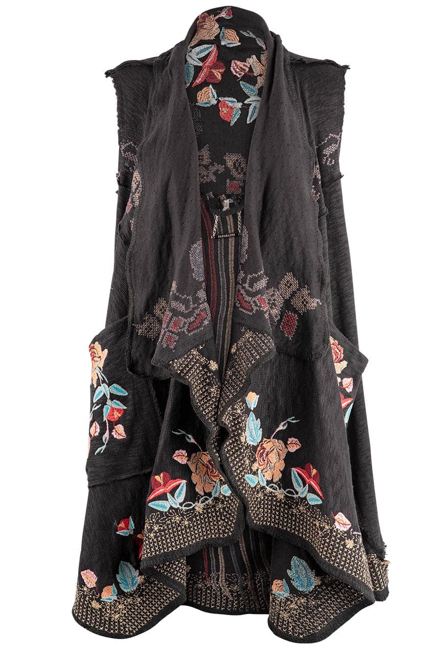 Paparazzi by Biz brings Boho chic to fall with this easy fit cotton duster vest. Black with waves of intricate floral embroidery traveling on the front, pockets and back. Pair with a turtleneck or sweater to transition into cooler weather.