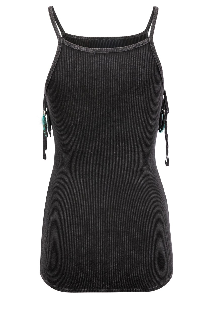 • Black ribbed cami with fringe