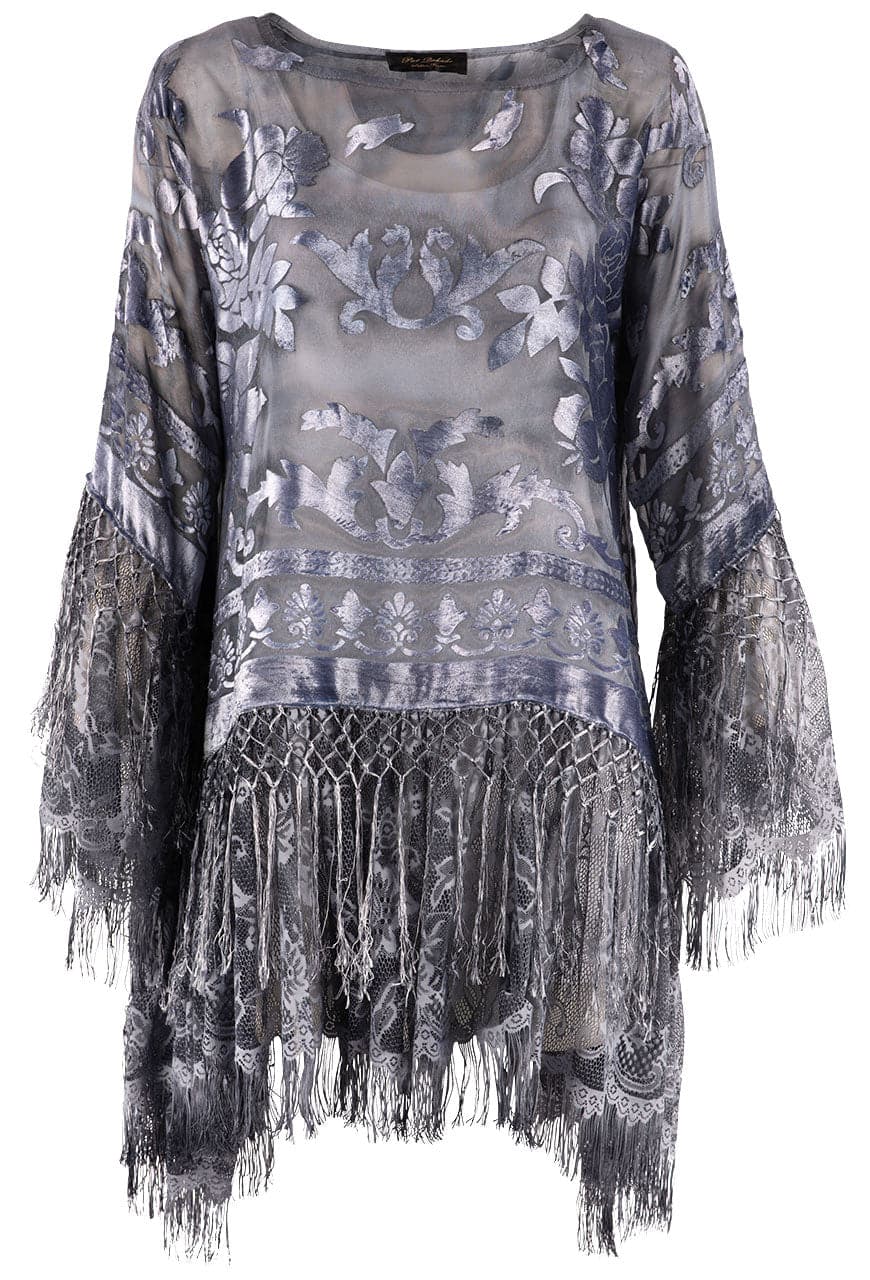 Fall in love with this elegant burnout velvet top by Pat Dahnke. Lace and fringe adorn the sleeves and hem to add a unique, romantic feel. Layer over a tank and pair with leggings or jeans to complete the look.