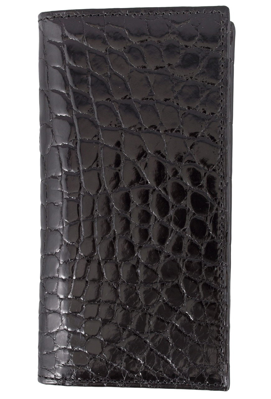 • The checretary wallet in genuine alligator is both exotic and sophisticated with six vertical card slots, three interior slip pockets and a checkbook pocket. Made for Pinto Ranch in the USA.