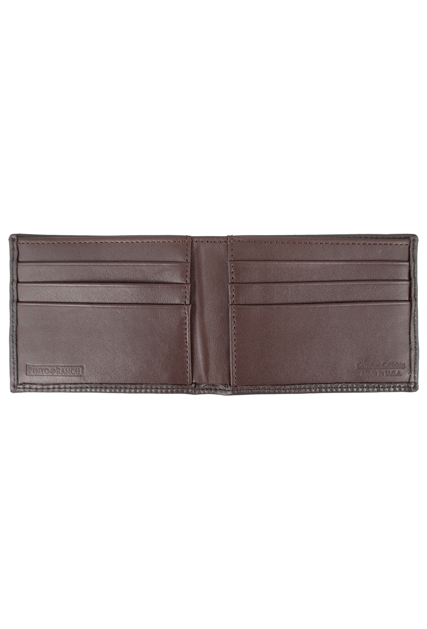 The slim fold wallet in genuine calf leather is sleek and practical with six card slots and three interior slip pockets.