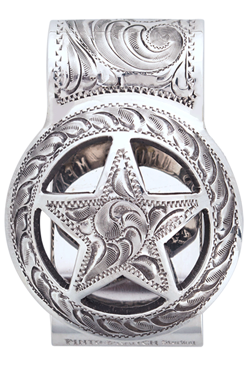 • The Pinto Ranch YY Collection is an exclusive collection made by local Houston, Texas silversmiths who have been perfecting the craft since the 1970’s. Using the finest sterling silver and 14k gold, each piece is crafted by hand. With the latest digital equipment, the design process is simplified allowing for each piece to be artfully hand-engraved. Both traditional and modern western themes are used to design buckles, cufflinks, money clips and bolo ties for Pinto Ranch.