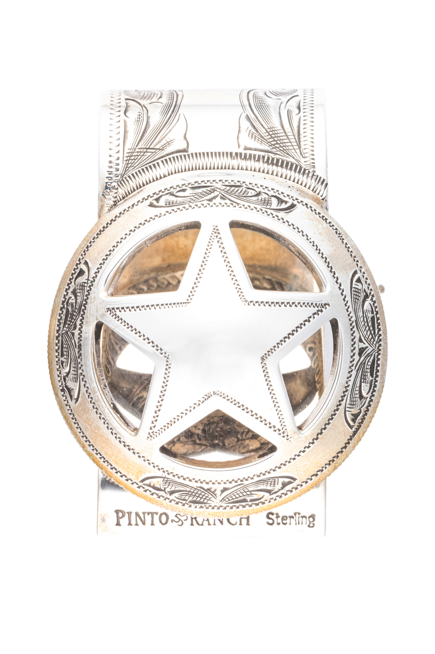 • The Pinto Ranch YY Collection is an exclusive collection made by local Houston, Texas silversmiths who have been perfecting the craft since the 1970’s. Using the finest sterling silver and 14k gold, each piece is crafted by hand. With the latest digital equipment, the design process is simplified allowing for each piece to be artfully hand-engraved. Both traditional and modern western themes are used to design buckles, cufflinks, money clips and bolo ties for Pinto Ranch.