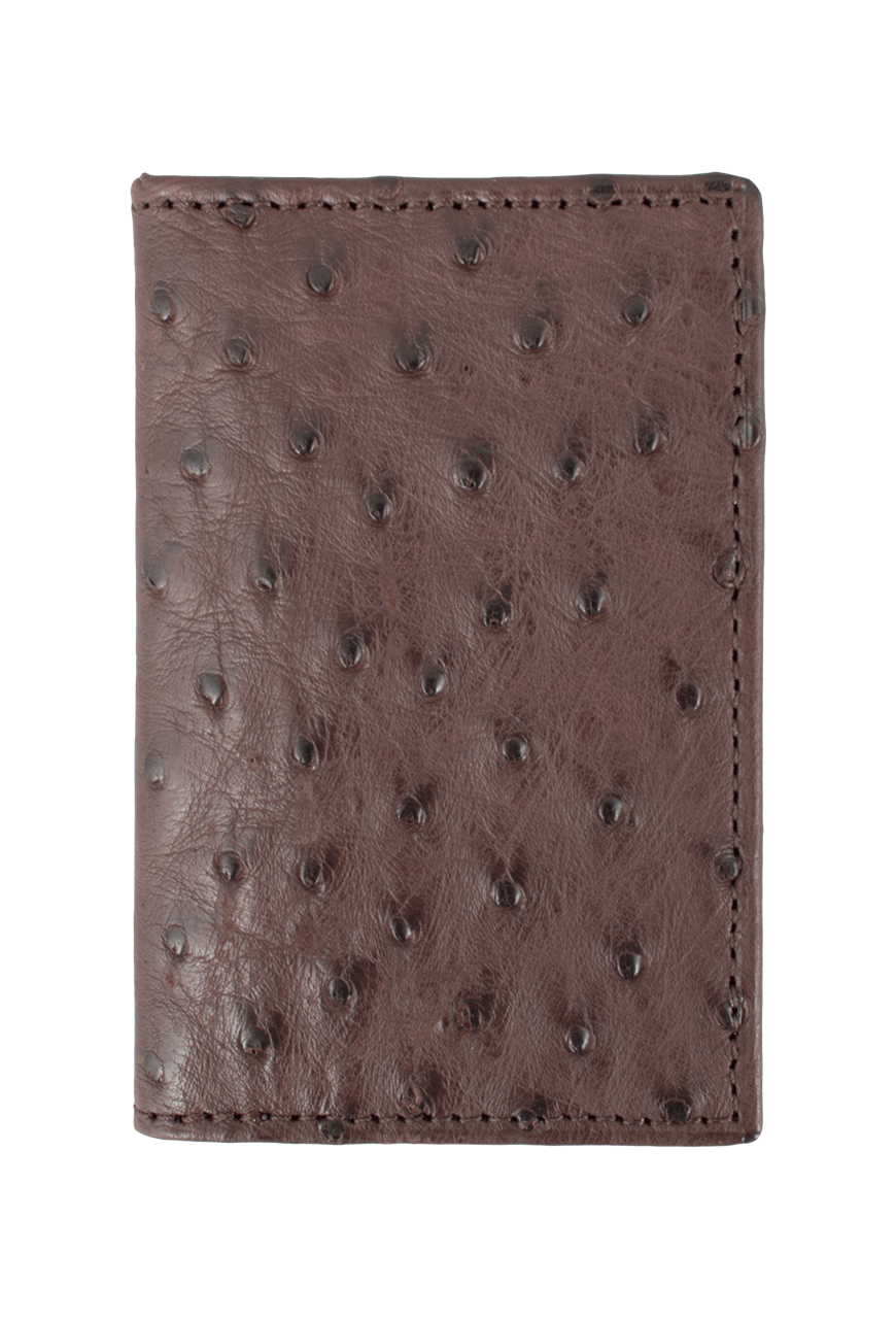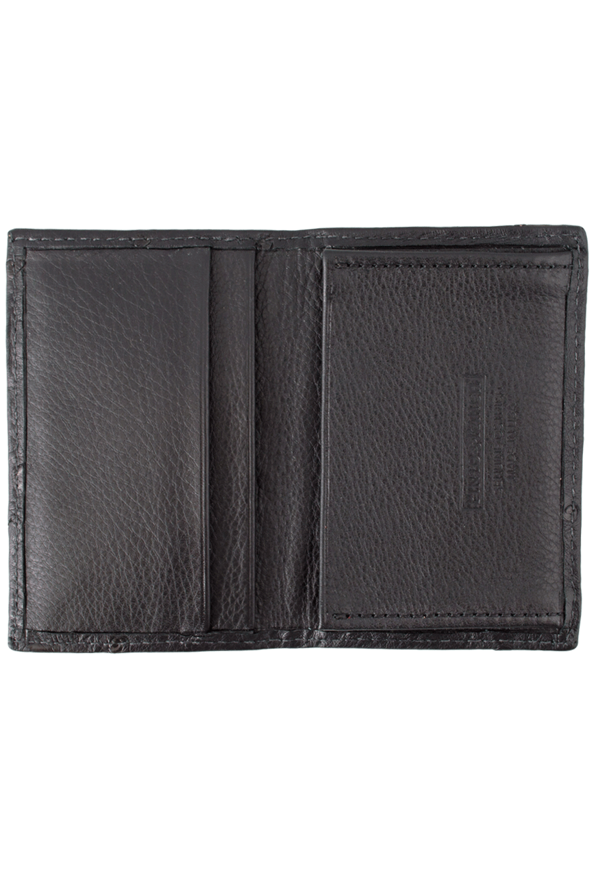The gusseted card case in genuine full-quill ostrich is both simple and sophisticated with two card slots and an interior slip pocket. Made for Pinto Ranch in the USA.