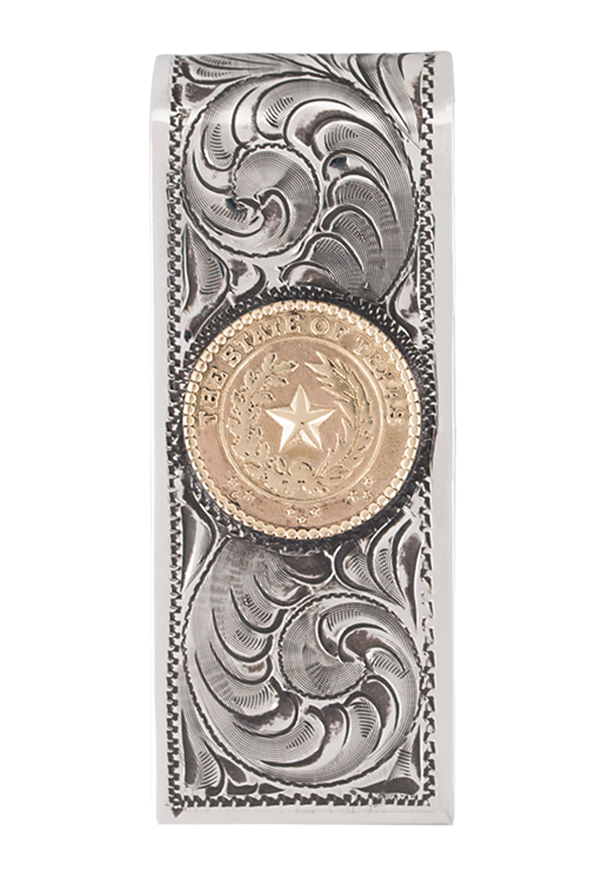 • Hand-engraved money clip with a 14K gold state seal of Texas design