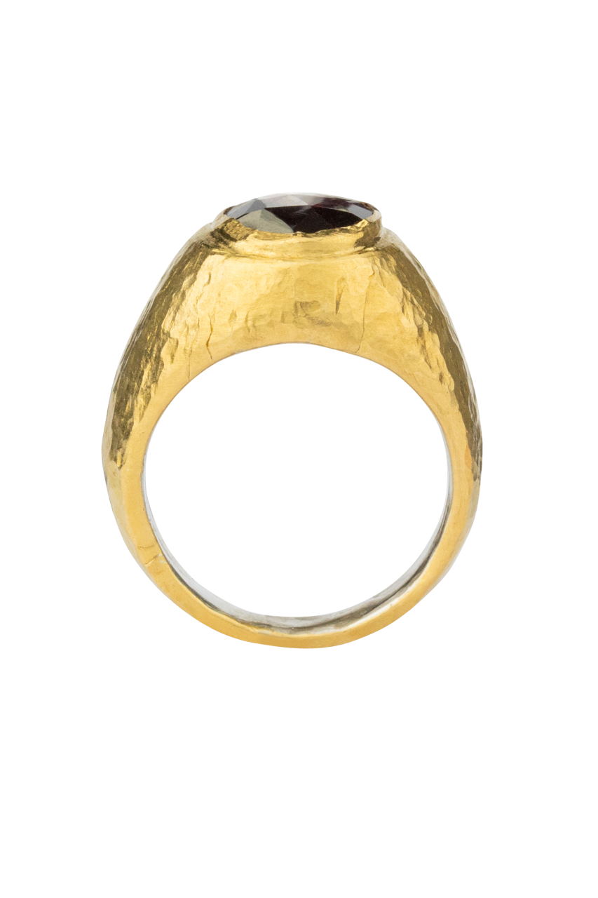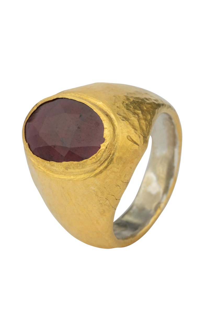 This lovely ring features a large, oval-shaped garnet in the center. It's set in a bezel setting and stands out brightly against the 24K yellow gold. The ring is made from both silver and gold for a stunning piece that is both durable and beautiful. The garnet at the center is 4.25 carats, lending it a deep red color that is perfectly juxtaposed with the bright gold.