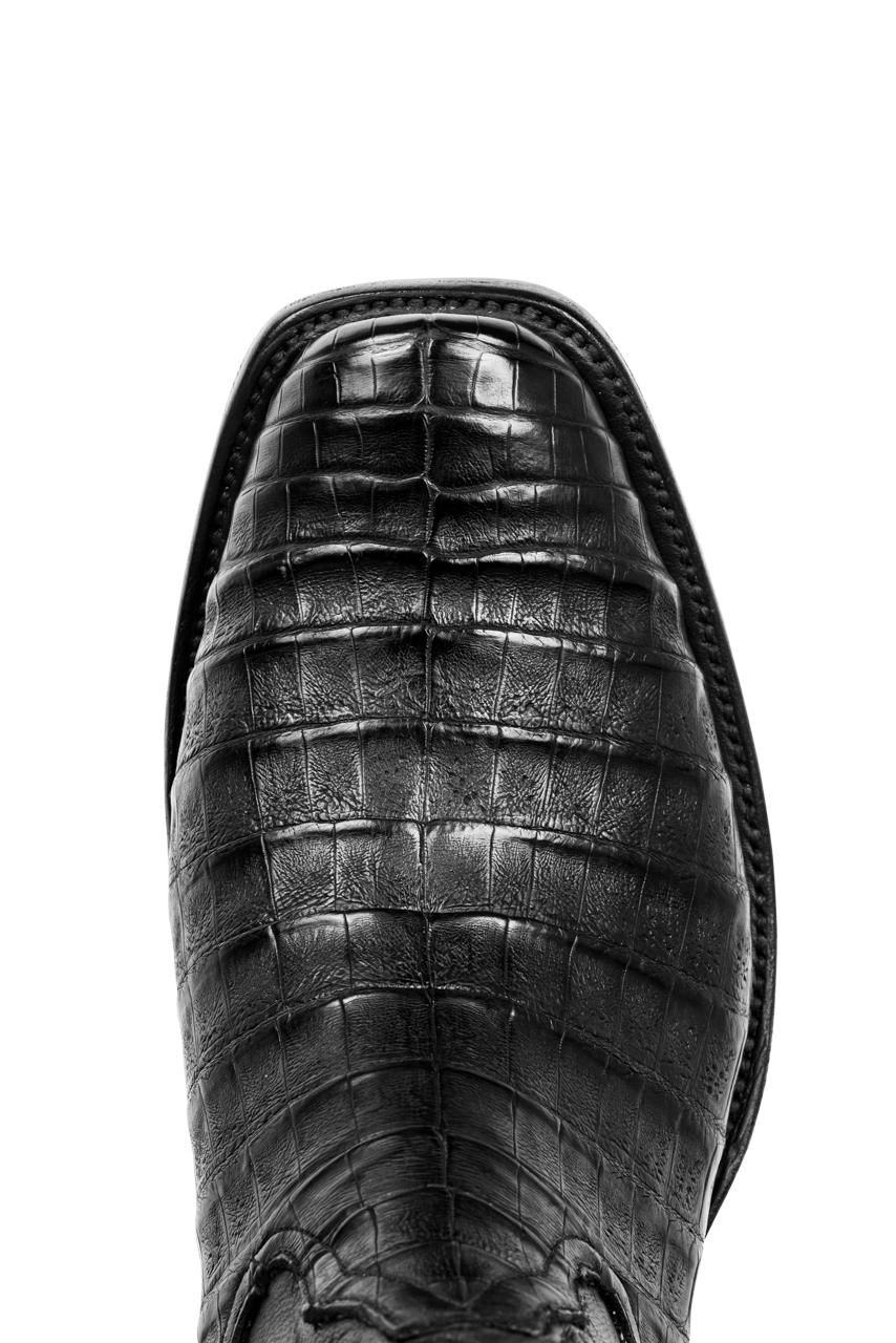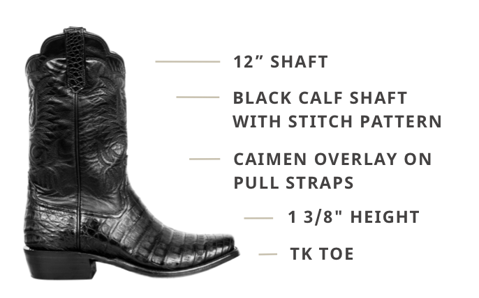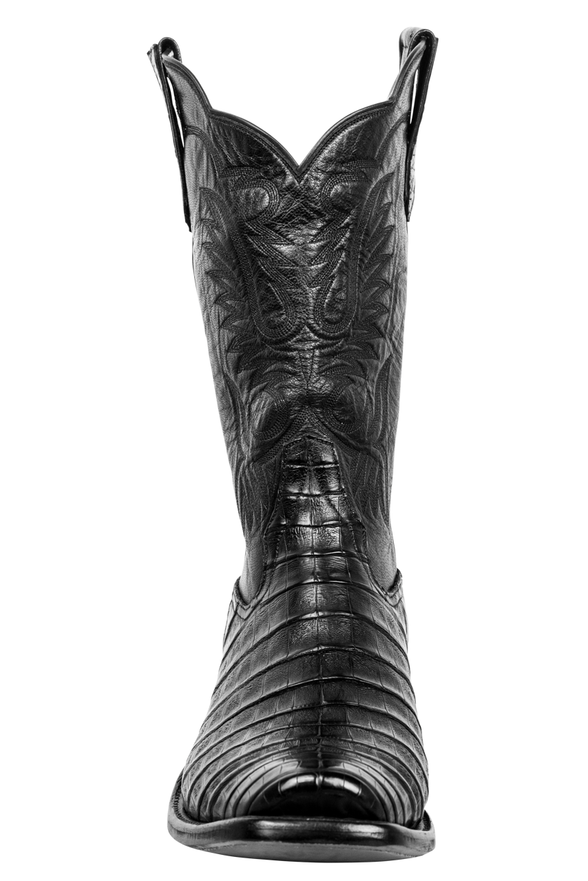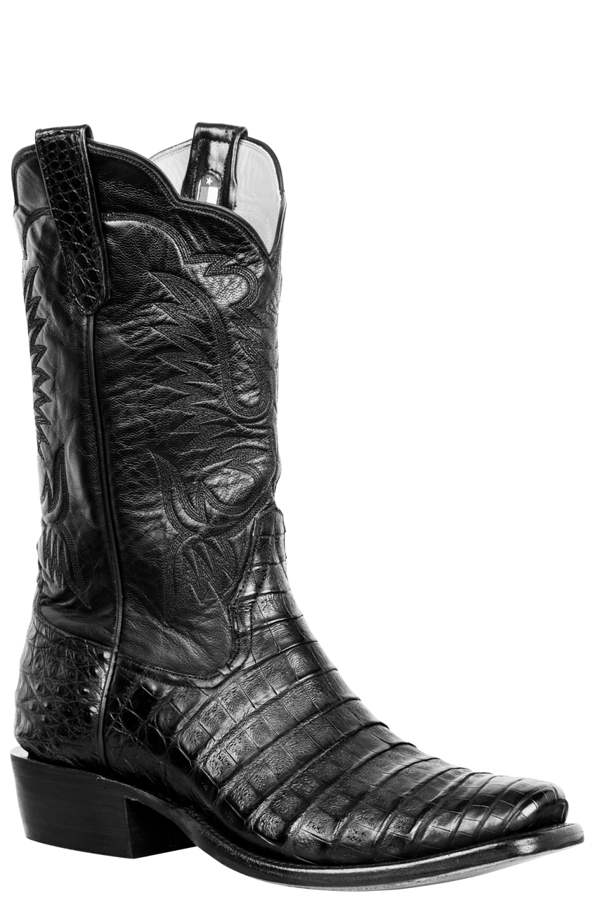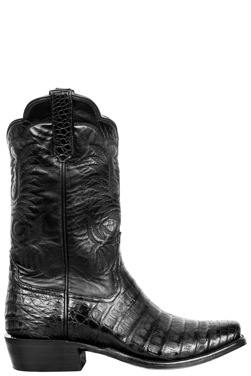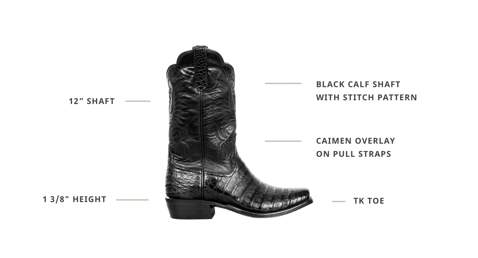 Elevate your Western wardrobe with Rios of Mercedes Black Caiman Belly Boots exclusively designed for Pinto Ranch. Premium materials and a tradition of expert-quality craftsmanship are the bottom line for this iconic brand. A bold 12" black calf shaft with a striking stitch pattern and rose scallop creates a classic profile that will effortlessly take you from work to play. A durable, yet extremely comfortable 3/4 welt construction features a cowskin lining and channeled leather insole with a cushioned insert. The 1 3/8" stacked leather heel, TK-toe, and every single inch of these handmade Rios are painstakingly constructed to outlast anything that comes your way. Pair them with your most casual weekend wear, or dress them up with a suit and tie.