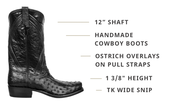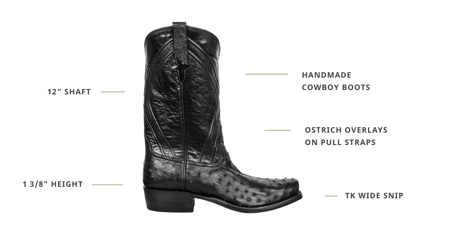 • 12" black calf shaft with X-cord stitch pattern & full quill ostrich vamps