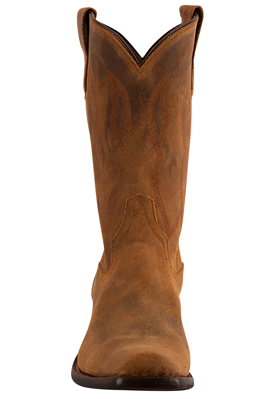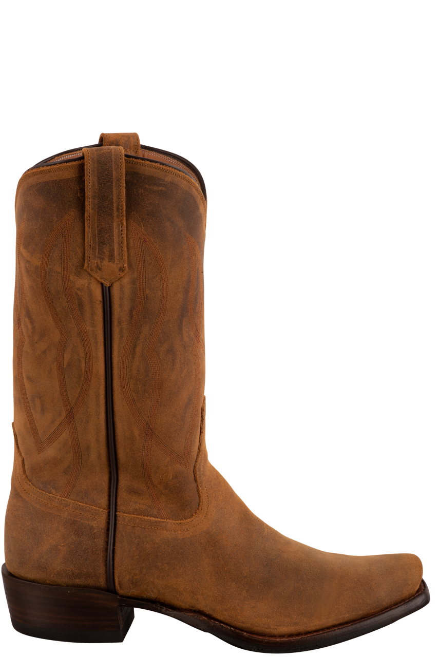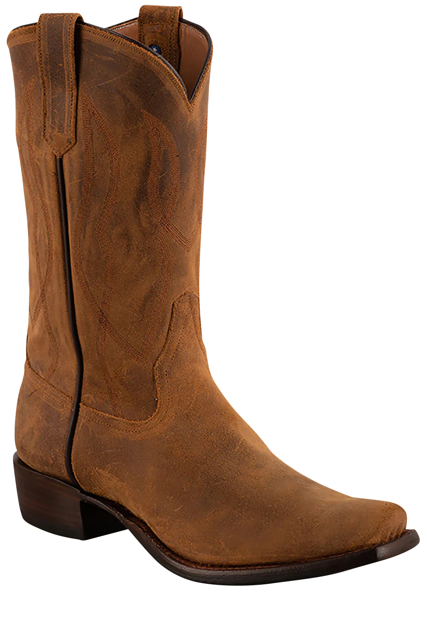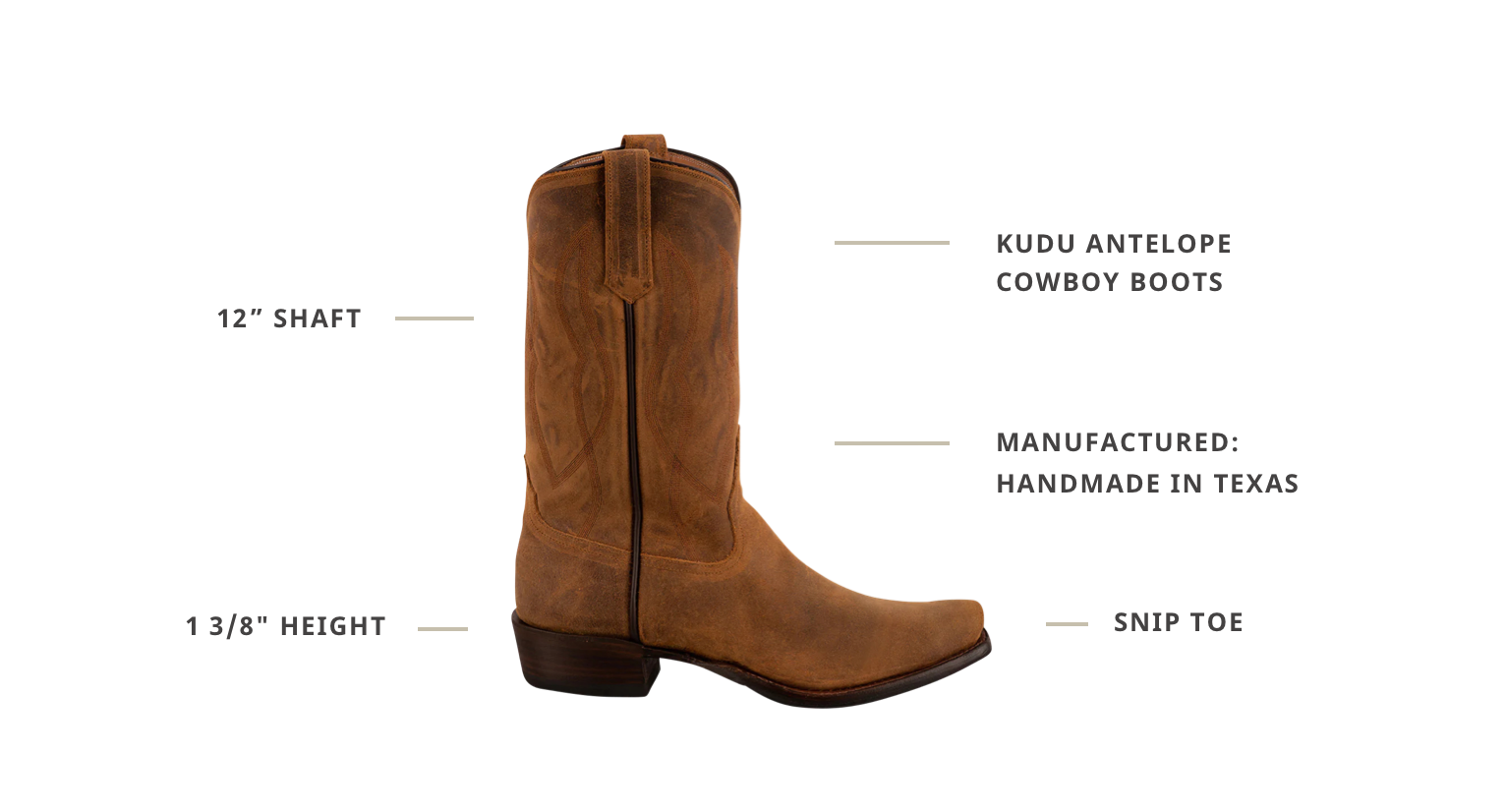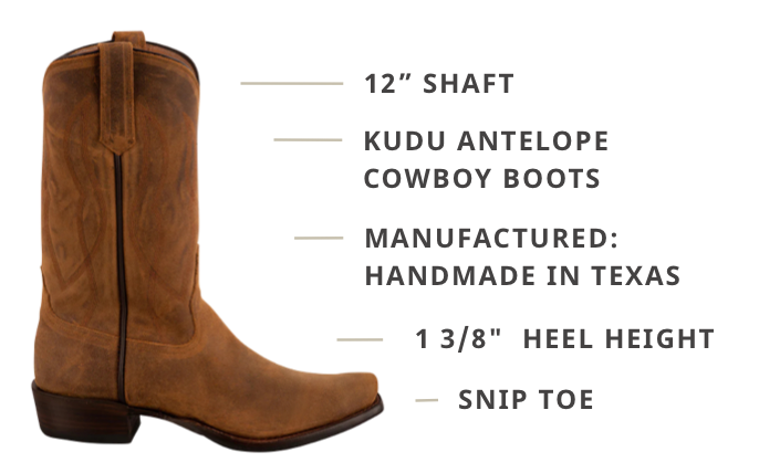 Unmatched, Unrivaled Understated: If you are looking for a pair of men's cowboy boots that are classic, durable and versatile, we have a pair of Rios of Mercedes that checks all the boxes. Made exclusively for Pinto Ranch, our Light Brown Kudu Antelope Cowboy Boots take quality and performance to the next level. This iconic brand handcrafts every inch of every boot with top of the line materials and the most excellent standards. Kudo Antelope is incredibly breathable and rugged, yet incredibly soft and supple, designing the perfect pair of hard working boots for a man on the move. The 12" shaft and pullstraps feature a subtle cascading rope design that creates a canvas for a handsome black hybrid outsole. The cushioned insole feels like you're walking on clouds and the practical 1 3/8" heel and roomy snip toe complete this class act.