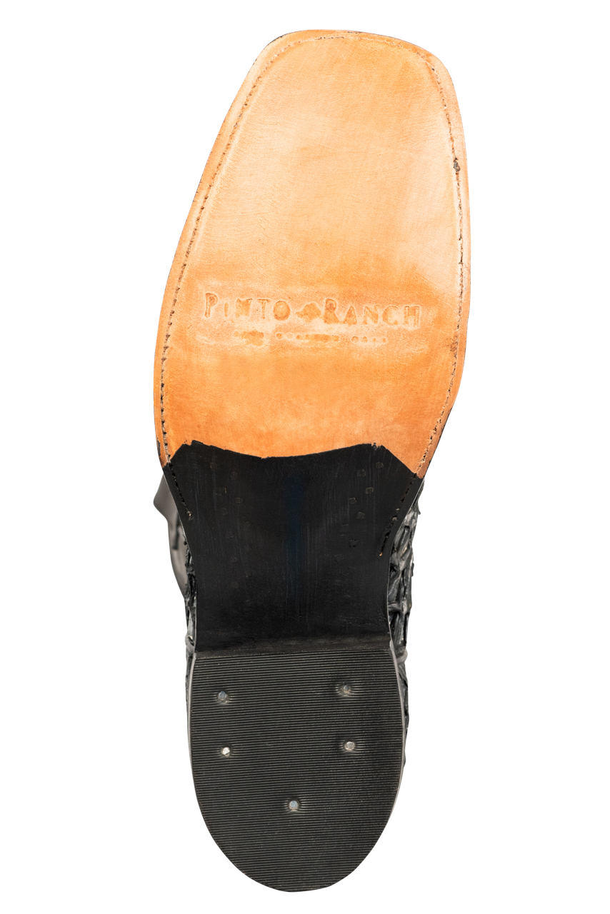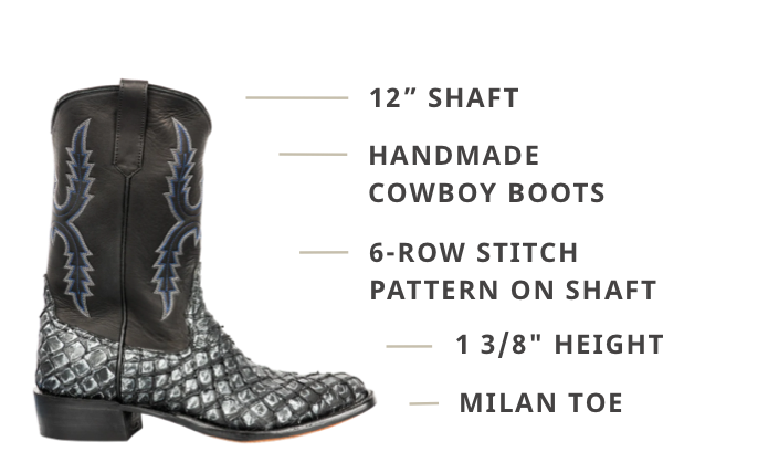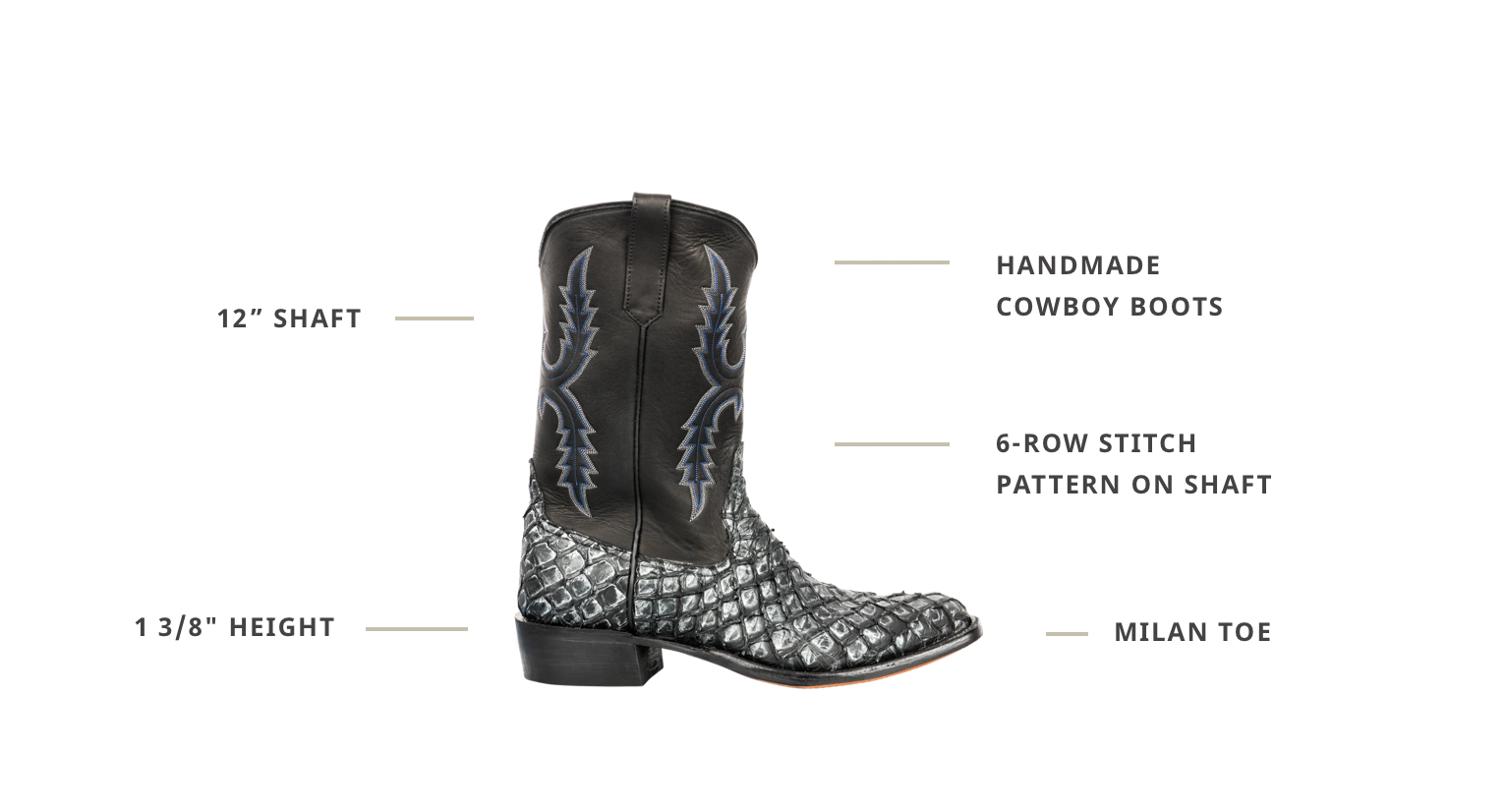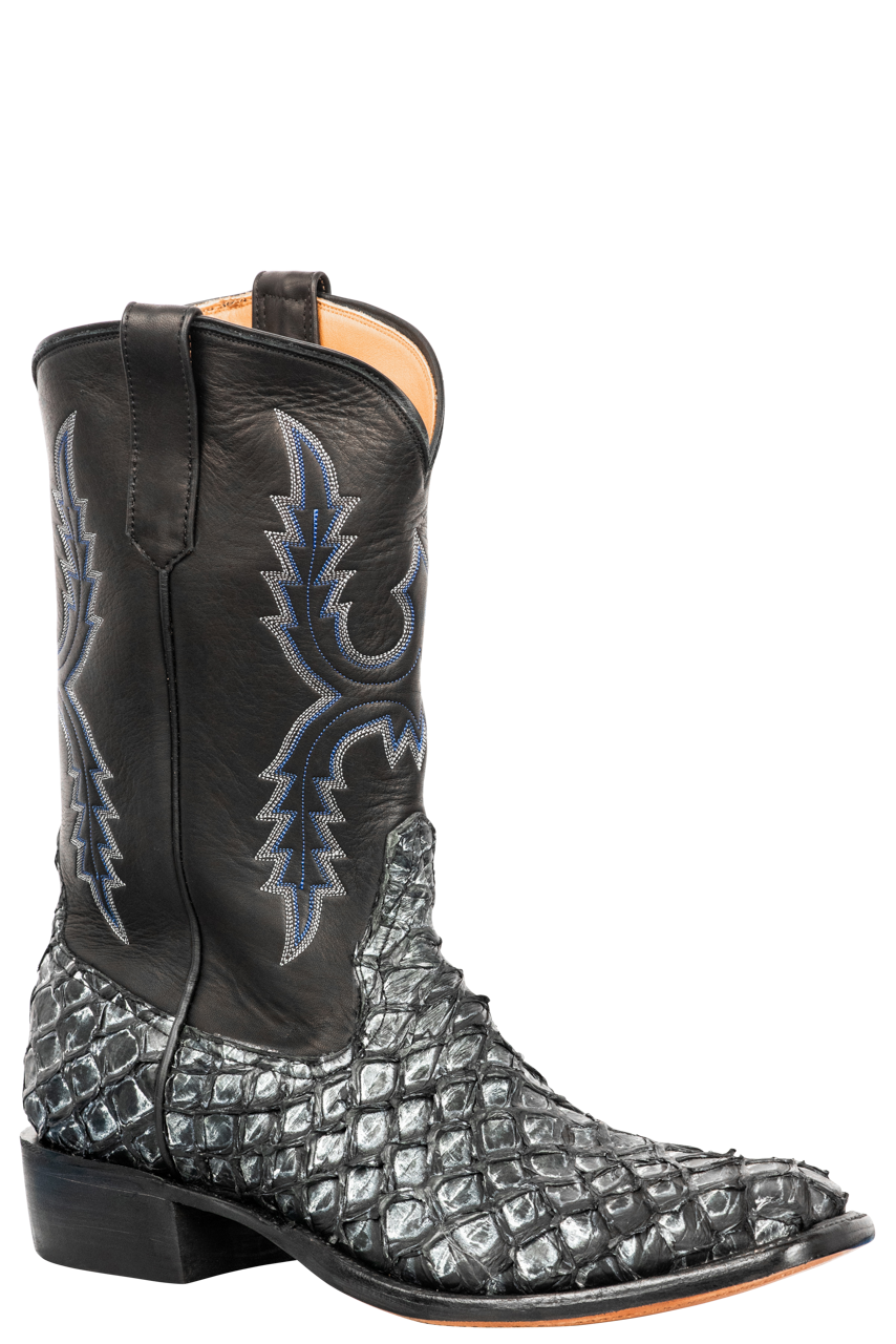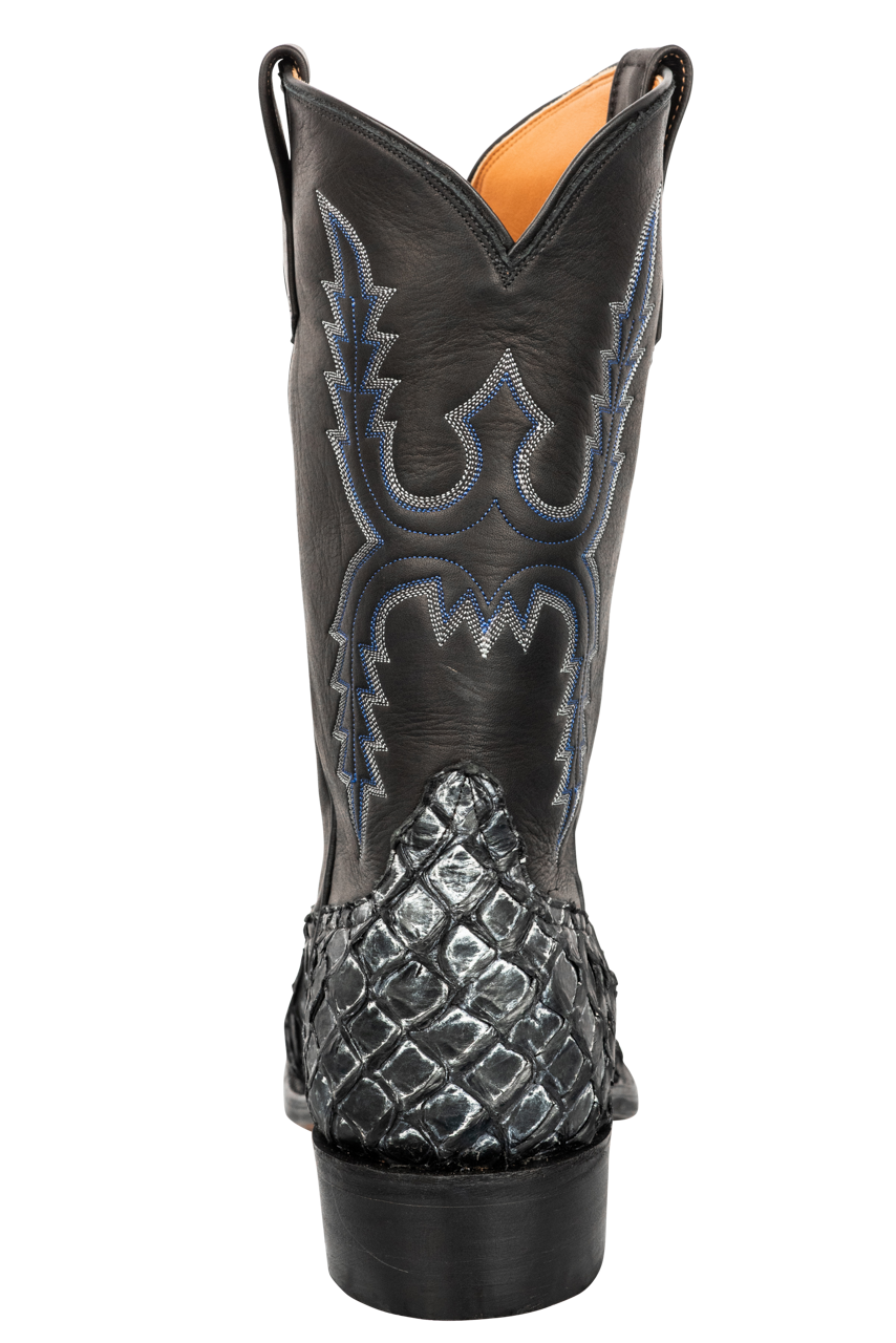 • Dashing & Distinct: This Pinto Ranch exclusive is a refined blend of land and sea. Rios of Mercedes Blue Steel Pirarucu Cowboy Boots feature a blue steel pirarucu vamp and a black remuda shaft. This complementary two-tone design is more than meets the eye. The skin pairing is dramatically different, with each offering notable texture and depth. The exotic pirarucu vamp showcases the special nuances of the fish's rugged skin. The bold black remuda 12" shaft with a 6-row stitch pattern takes the look to the next Western level. Like all Rios, these all-leather fully lined boots are constructed with ultra comfort and longevity in mind. The deep scallop pull straps, 1 3/8" stacked leather heel, cushioned insert, and roomy milan toe round out this distinct and dashing profile.