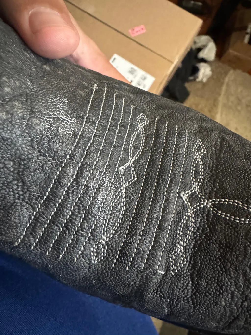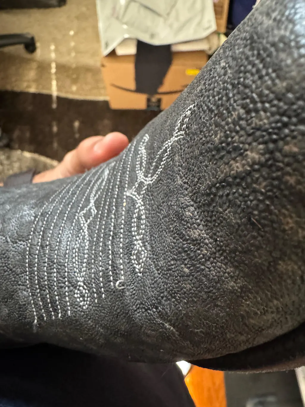 Safari style goes western with these unique genuine elephant and calfskin boots, and no pair is exactly alike. The exotic boots feature elephant vamps and pull straps and black calfskin shafts with gray chain stitching and a cross cord pattern. The new 'TK' toe style is in between a snip toe and a square toe for style and comfort. The signature Rios cushioned insoles allow for easy, all day wear.