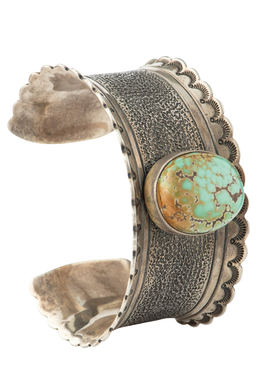 This hand-crafted piece was made in the USA and is completely one of a kind. It's a bracelet that uses a unique type of turquoise against a thick silver band. Royston turquoise is known for its vibrant green color, and it has its matrix visible so that each piece is special. The unusual color and traditional silver work together perfectly for a bracelet you'll want to wear to make a statement.