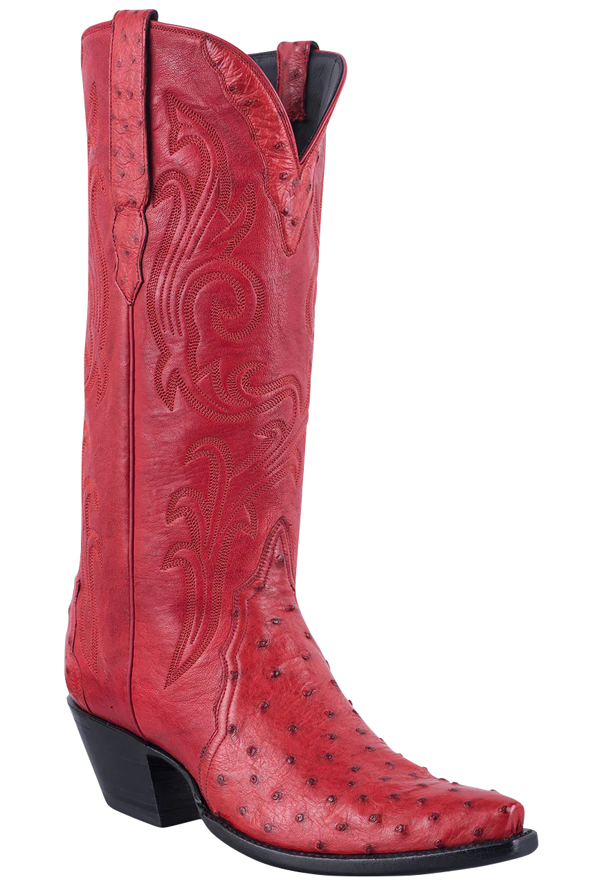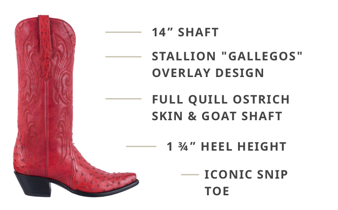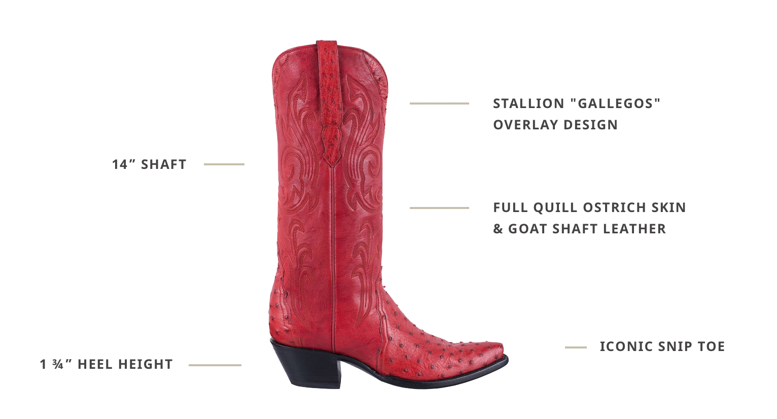Sophisticated All-Season Style: When you're looking for a quality, comfortable boot that brings her A game throughout the entire year, Stallion's Full Quill Ostrich Cowboy Boots are sure to please. First, this bright red headturner will soon become your new go-to staple. Stallion is known for its iconic, quality craftsmanship and this is exactly what these beauties emulate. The classy 14" super soft leather shaft features a southwestern-inspired Gallegos overlay design that seamlessly blends into a striking yet subtle pattern on the snip toe. Everything about these iconic beauties is timeless, including the red fancy pull straps for easily getting them on and off and a 1 3/4" heel creating a timeless silhouette that is as comfortable as it is gorgeous.