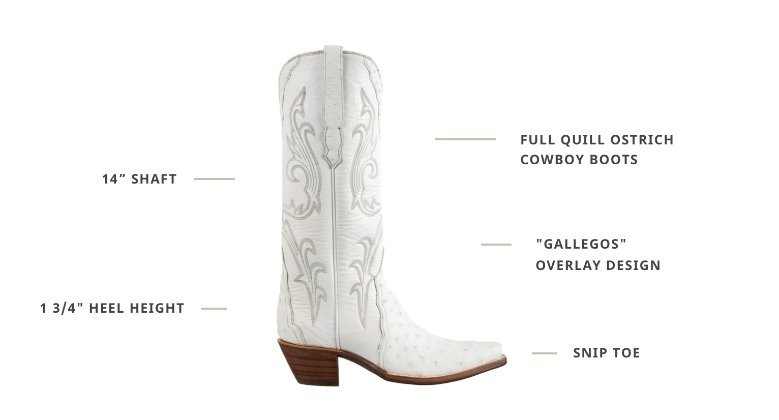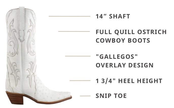 Sophisticated All-Season Style: When you're looking for a quality, comfortable boot that brings her A game throughout the entire year, Stallion's Full Quill Ostrich Cowboy Boots are sure to please. First, this wonderful all-white headturner will soon become your new go-to staple. Stallion is known for its iconic, quality craftsmanship and this is exactly what these beauties emulate. The classy 14" super soft leather shaft features a southwestern-inspired Gallegos overlay design that seamlessly blends into a striking yet subtle pattern on the snip toe. Everything about these iconic beauties is timeless, including the white round pull straps for easily getting them on and off and a 1 3/4" heel creating a timeless silhouette that is as comfortable as it is gorgeous.