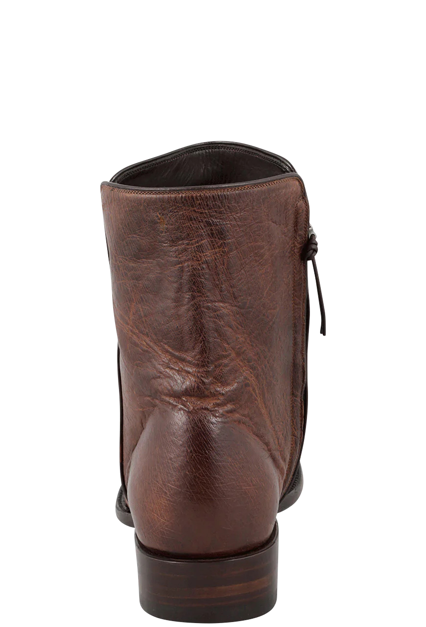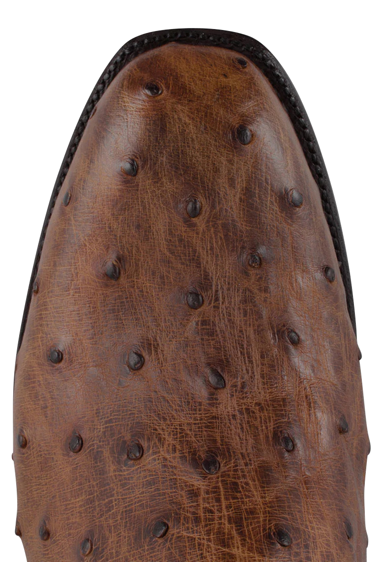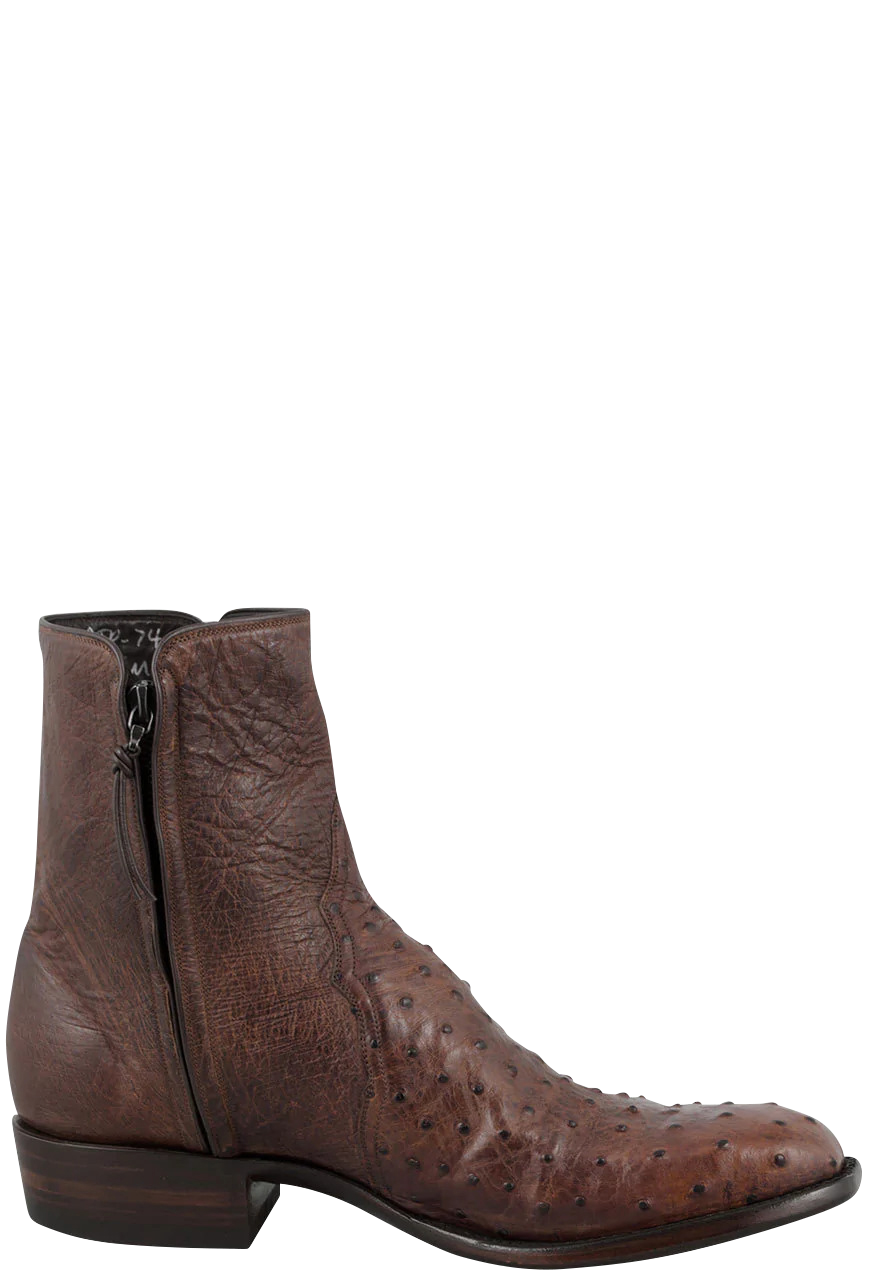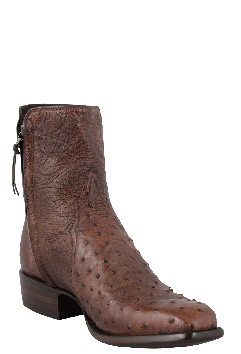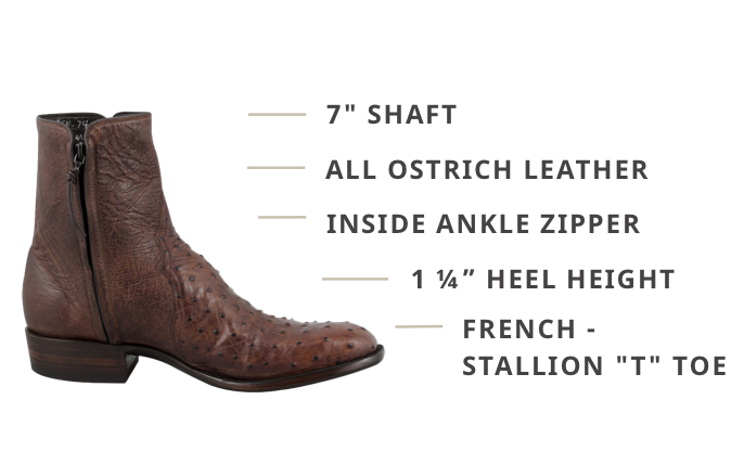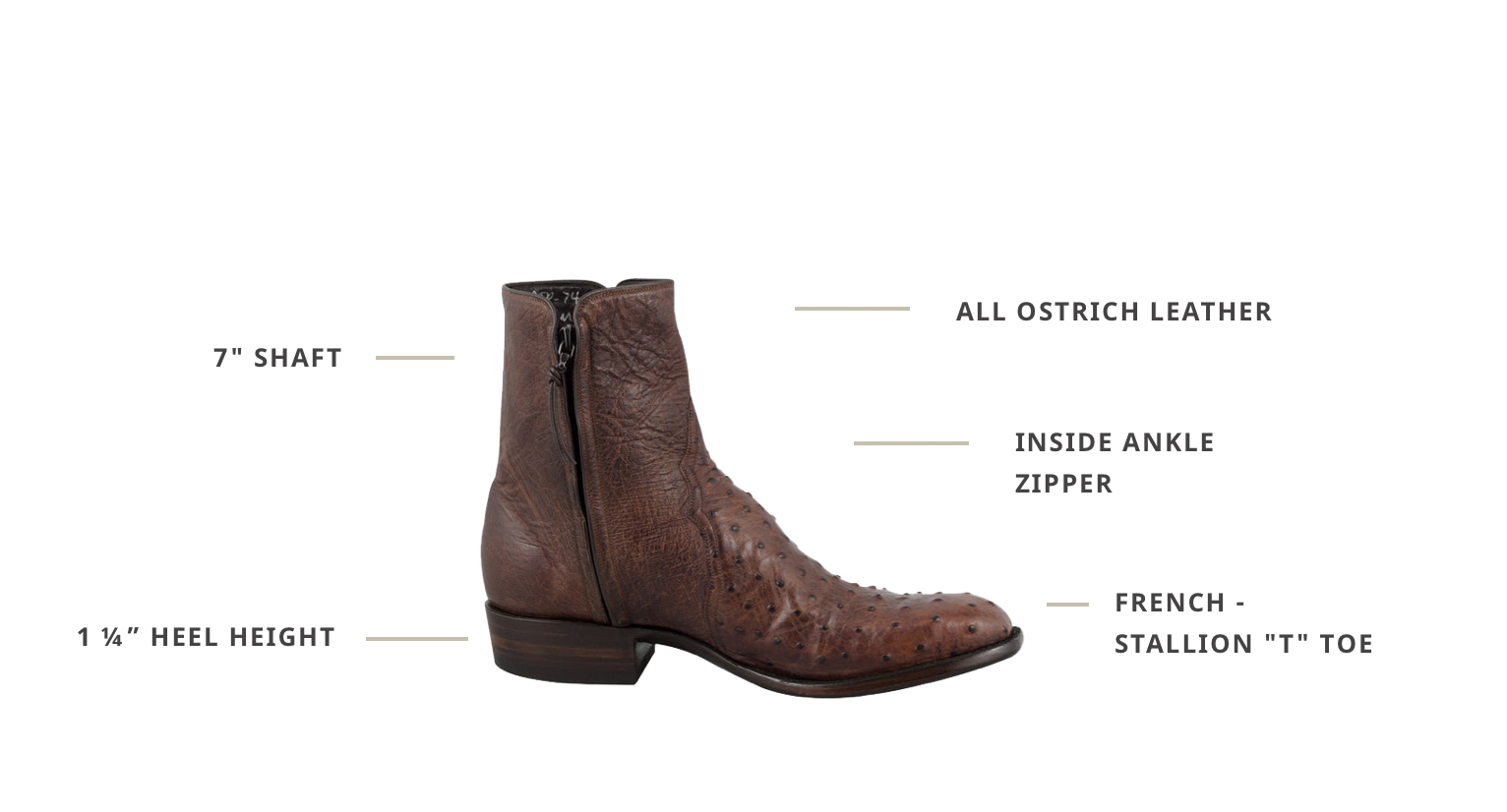 These boots are made entirely from ostrich leather. The vamp is made with full-quill ostrich while the rest of the boot is constructed with smooth ostrich. It's a zippered ankle boot that can be seamlessly worn under any pair of trousers. Stallion blends a bold contemporary style with vintage details. These boots have a fashionable french toe and a 1 1/4" walking heel. A zipper at the inner shaft makes the sleek Zorro easy to put on and take off.