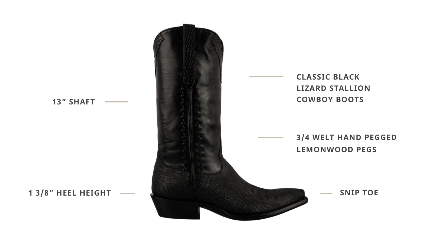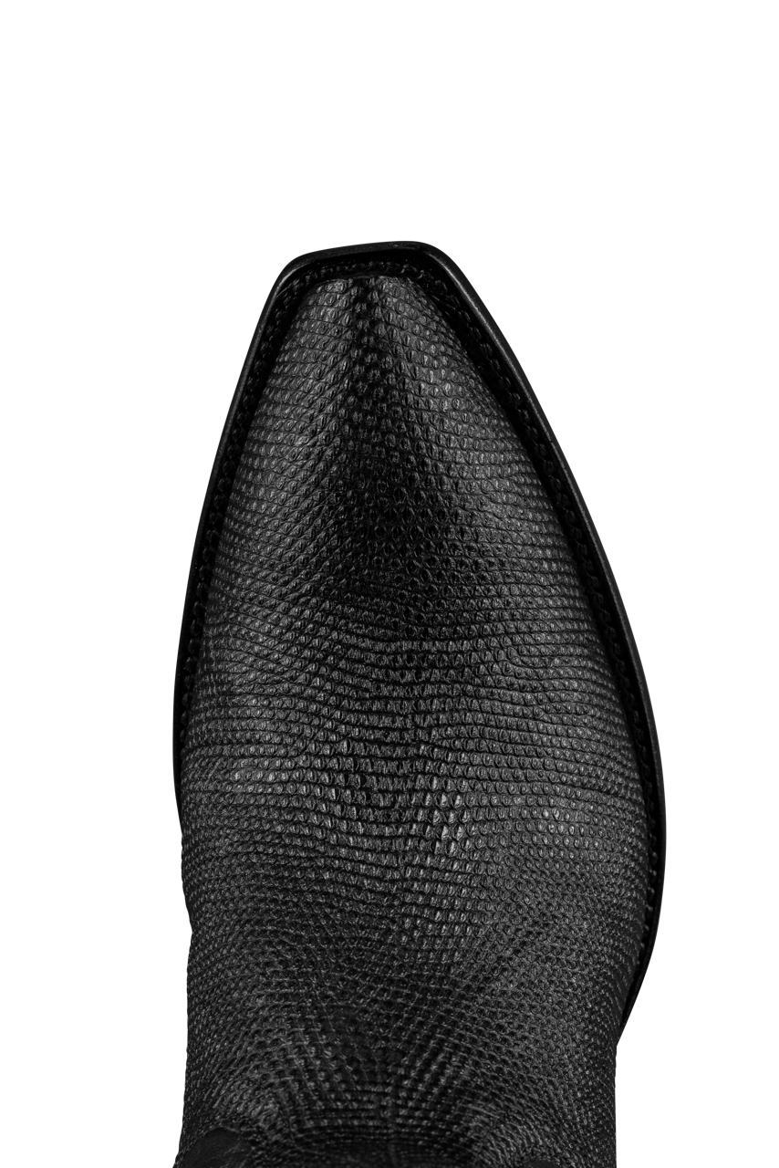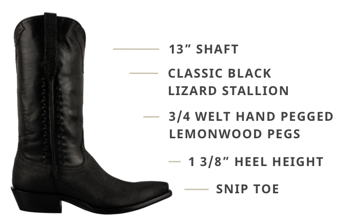 Step out in a piece of iconic American tradition. Classic black lizard Stallion cowboy boots will take you wherever you need to go. Each fashion-forward pair is handmade in El Paso, TX, with quality, care, and the utmost comfort in mind. These boots are strong, rugged, resilient, and ready for any adventure the day or night can bring.