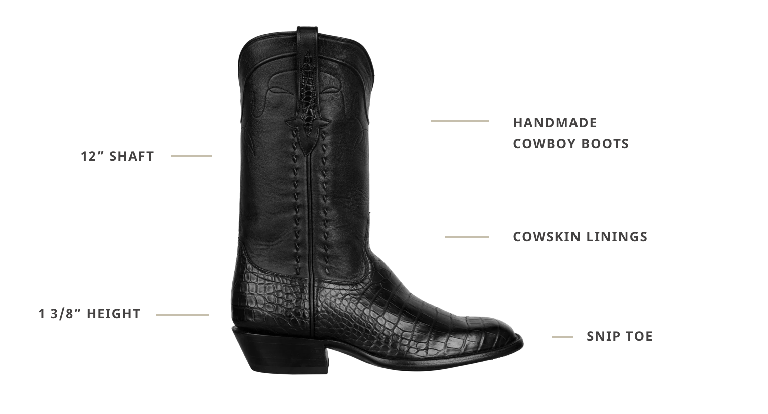 True Blue Classic: Head out wearing a pair of iconic Stallion Black American Alligator Boots, the perfect companion for cowboys on the go. These hard-working classics raise the bar on comfort, style, and American tradition. True to the quality Stallion brand, every single detail of these sharpshooters hit the mark! The 12” calfskin shaft with corded collar detail with buck skin stitching is a nod to cowboy traditions. Plus, the cowskin linings, the leather outsole, and the channeled leather insole serve up the comfort you need to hit the dusty trail wherever it leads. The 1 3/8” stacked heel, 3/4 welt construction, and timeless French style toe add an element that coordinates with everything in your handsome wardrobe.