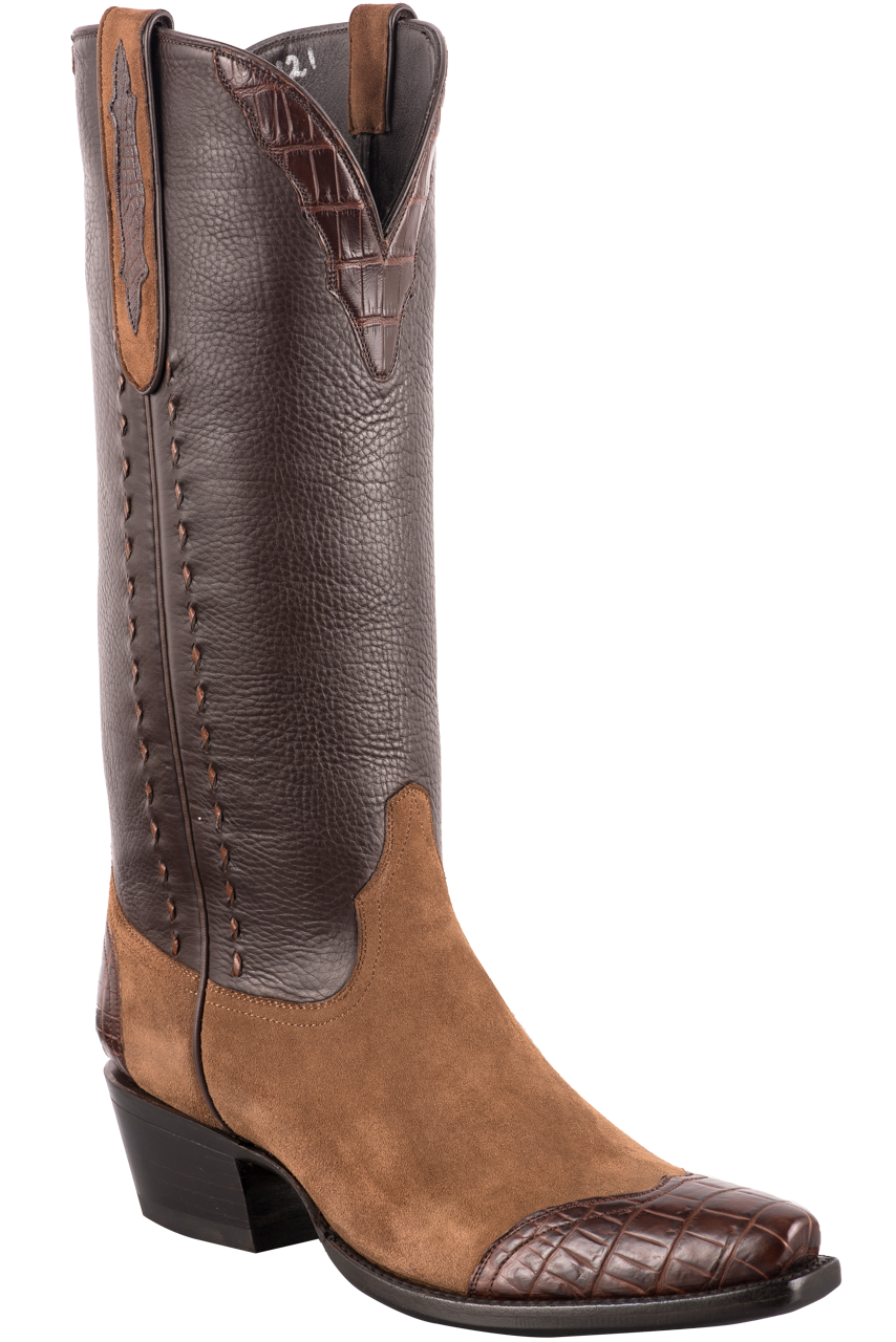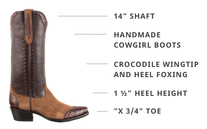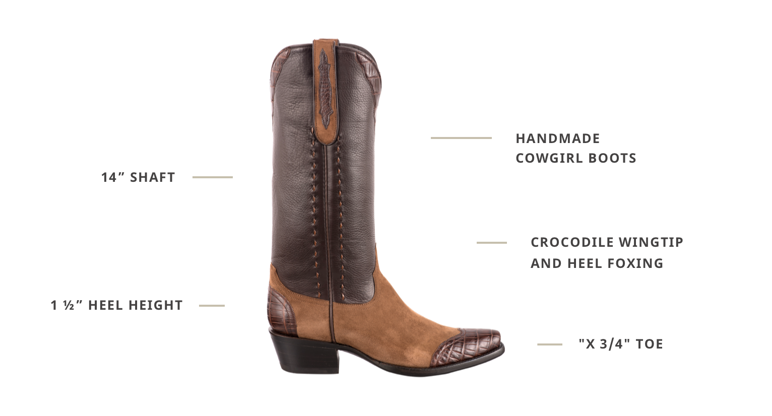 • Handmade in Texas by Stallion, these Cowgirl boots are elegant, rugged, and luxurious. Soft and beautifully textured, they feature a tobacco lamb suede foot and chocolate Italian leather shaft. The crocodile wingtip and heel foxing deliver just the right amount of flair and are highlighted by a contrasting buck lace design.