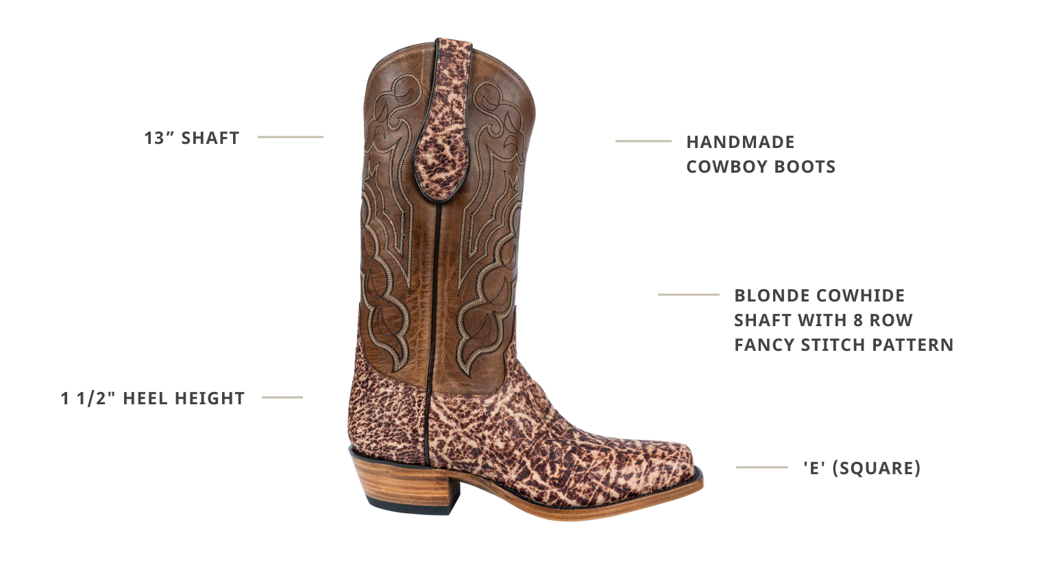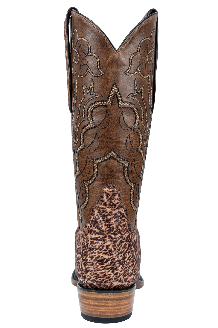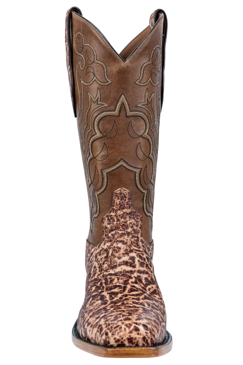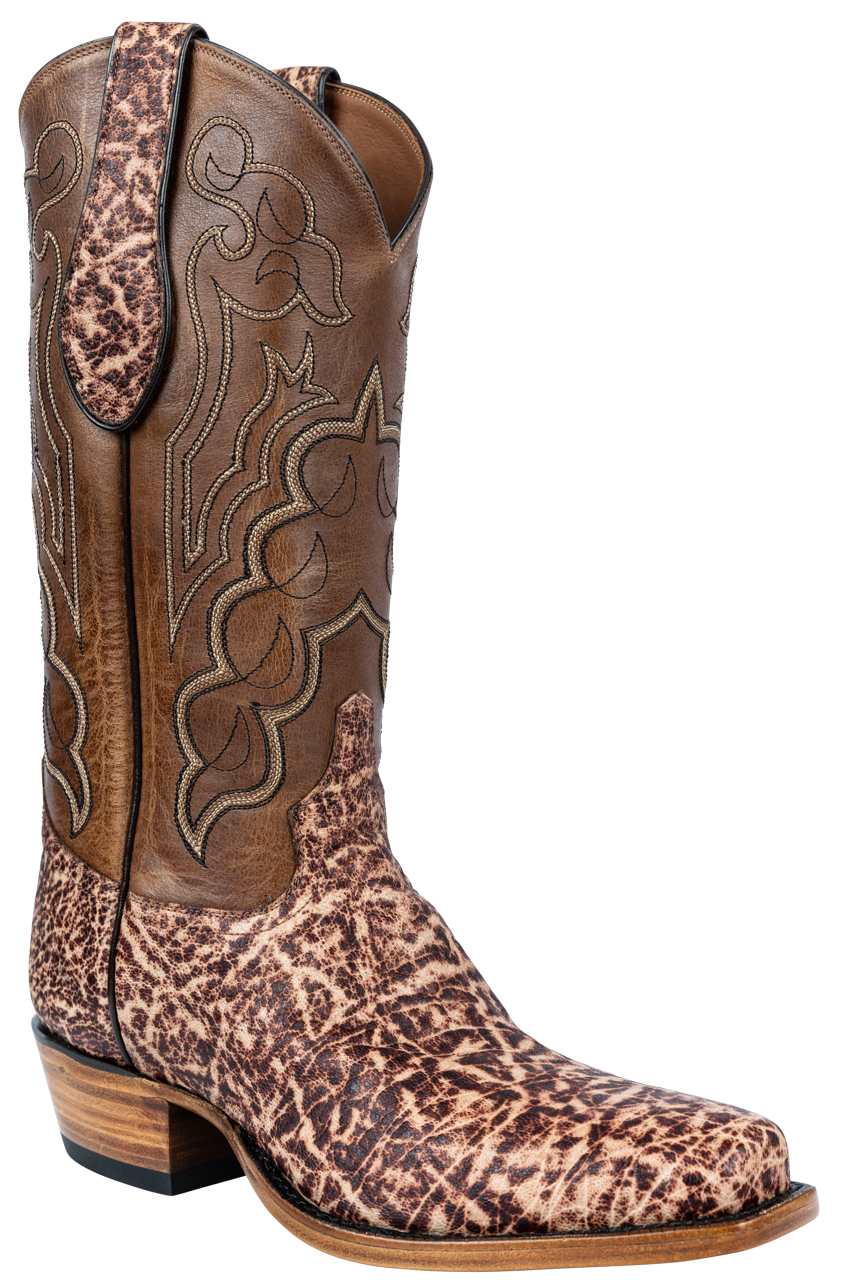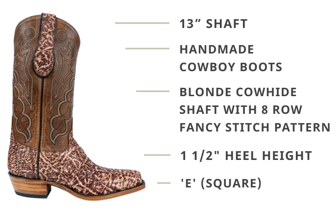 These cowboy boots use some of the finest materials for a look and feel you'll love. Elephant skin and cowhide are used to make these boots something special. There's a vintage elephant vamp as well as elephant pull straps, the shafts are made from blonde cowhide, and there is an 8-row, fancy stitch pattern to make them stand out. The intricate design of the shafts goes perfectly with the intricate pattern on the elephant portion of these boots.