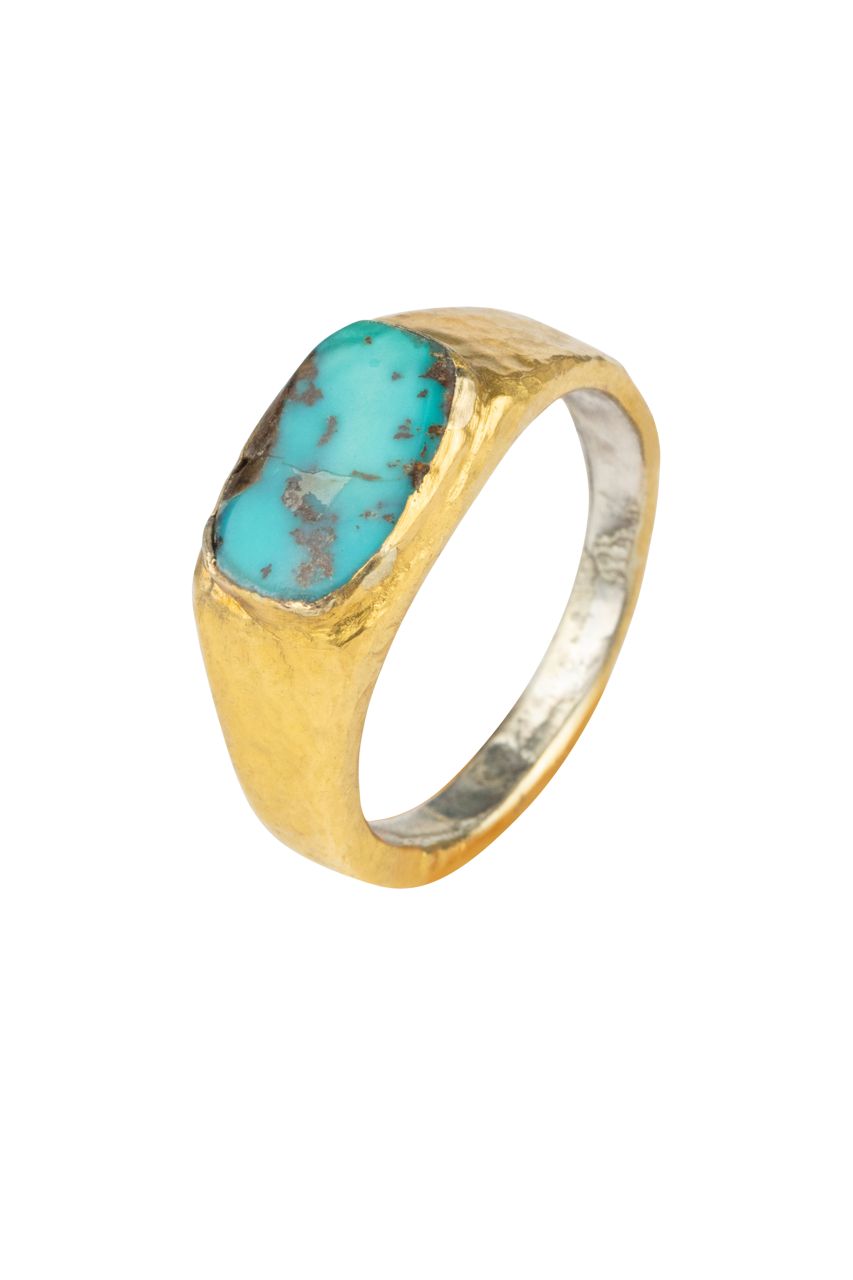This 24K yellow gold turquoise ring lined in silver is unique in that the brilliant blue gemstone is imported Turkish turquoise. Subtle yet tastefully alluring, the turquoise gemstone is bound to attract compliments every time you wear it.