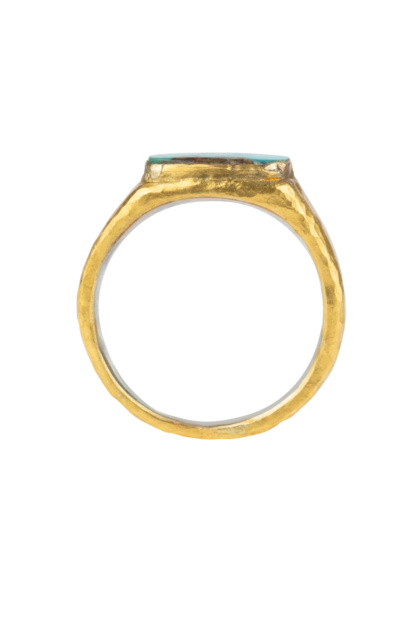 • This 24K yellow gold turquoise ring lined in silver is unique in that the brilliant blue gemstone is imported Turkish turquoise. Subtle yet tastefully alluring, the turquoise gemstone is bound to attract compliments every time you wear it.